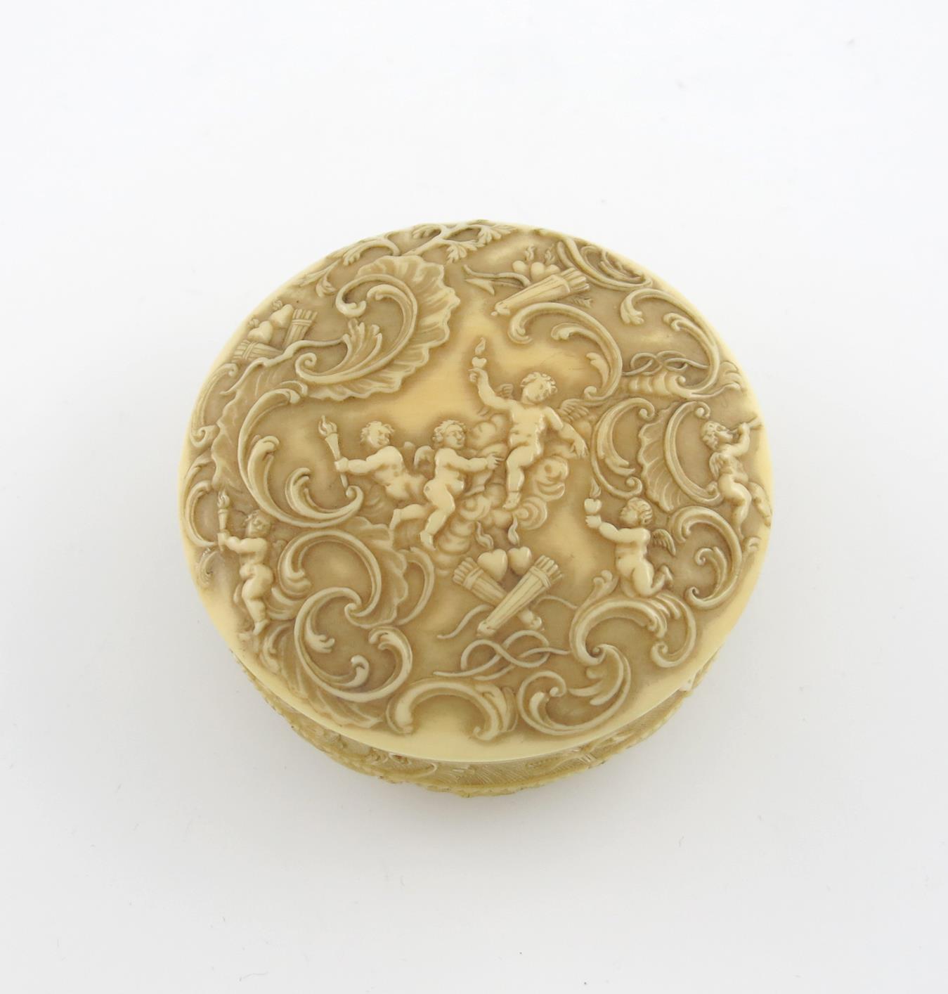 circular form, the cover carved in relief with six frolicking putti among clouds, torches and flaming hearts between foliate scrolls, the base carved in relief with cupid looking down from a cloud over two putti and two birds, diameter 7.5cm.