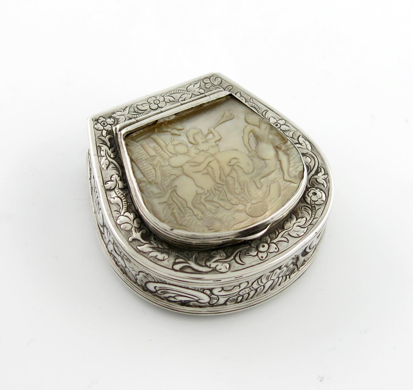 horseshoe form, chased and embossed foliate scroll borders, the hinged cover with a figural scene, the base engraved, length 7.5cm.