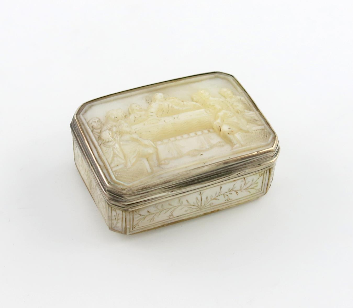 A late 18th century silver-mounted mother-of-pearl snuff box