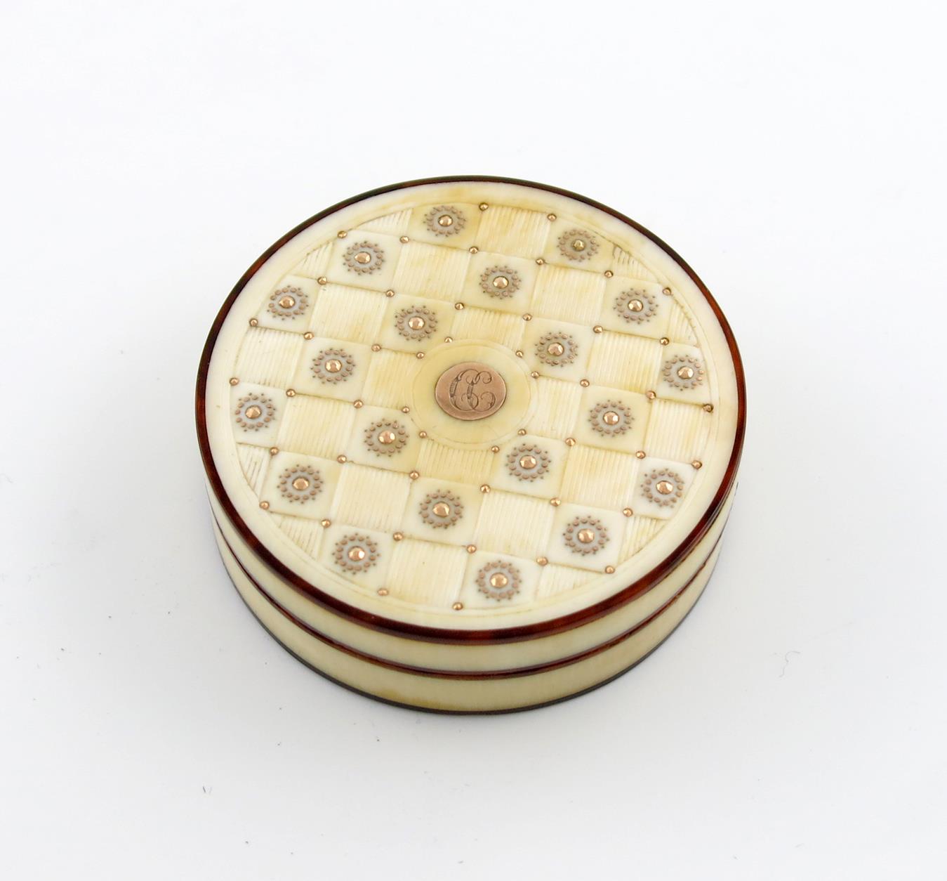 circular form, the pull-off cover with carved basket-weave squares with alternate panels with stud decoration, the centre with a circular initialled cartouche, tortoiseshell lining and stringing, diameter 6cm.