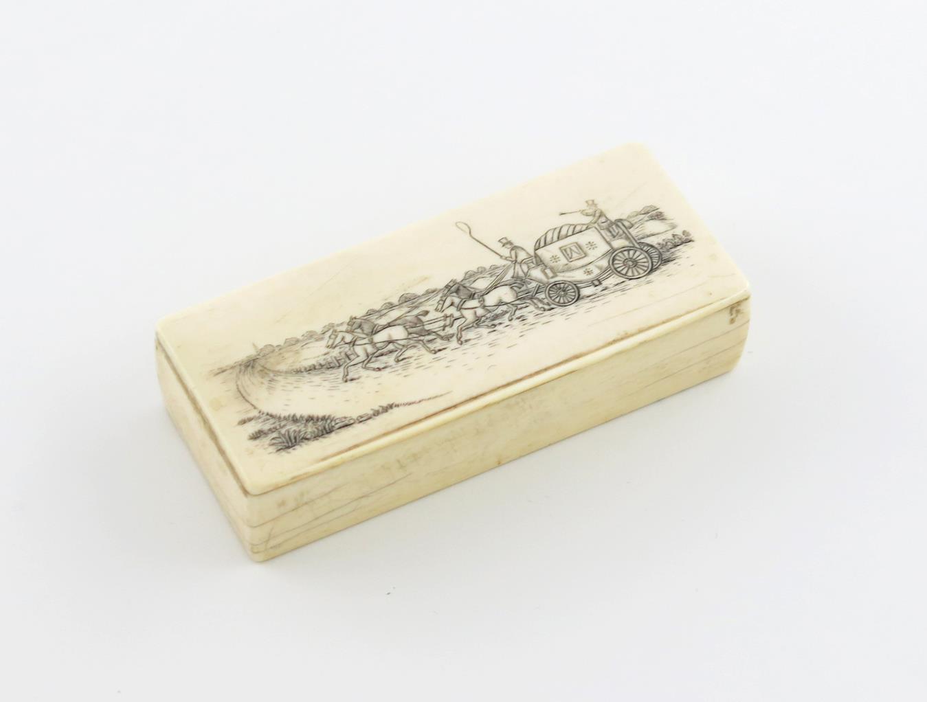 rectangular form, the hinged cover with a coaching scene, length 9.7cm.