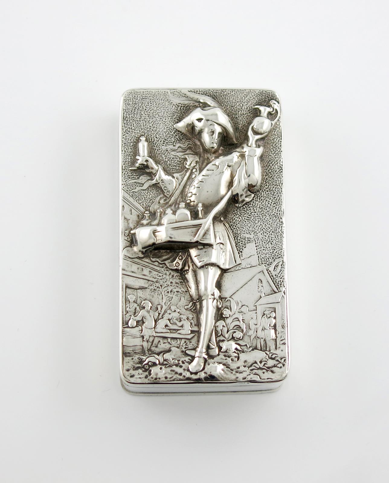 rectangular form, the hinged cover with a scene of a standing pedlar with a tray of his goods, silver-gilt interior, plain sides and base, length 9.8cm, approx. weight 5.4oz.