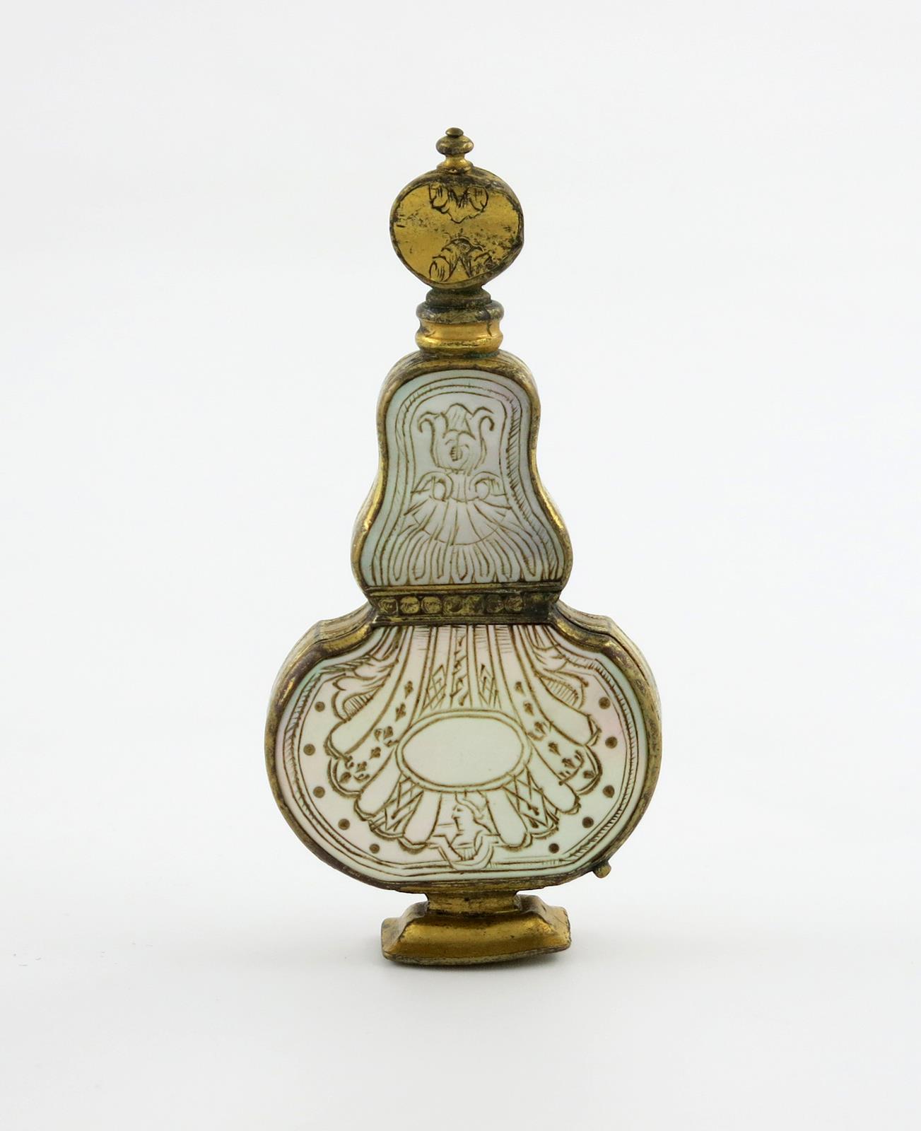 A mid 18th century gilt metal mounted mother-of-pearl snuff box / flask unmarked