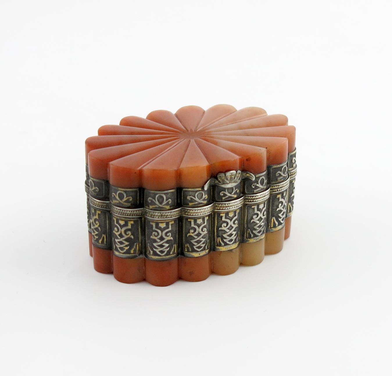 oval fluted form, the cover and base with radiating decoration, the mounts with chased strap-work on a matted background, silver-gilt lined interior, length 8cm.