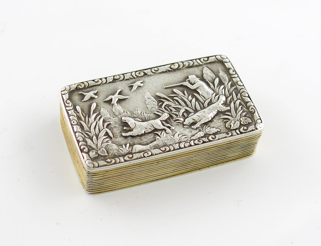 rectangular form, the hinged cover with a raised relief of a man shooting game with two gun dogs, reeded sides and engine-turned base, with a vacant cartouche, length 6.8cm, approx. weight 2.5oz.