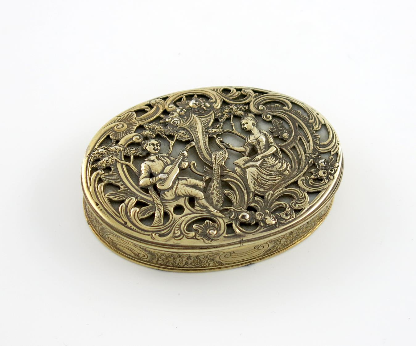 oval form, the hinged cover with mother-of-pearl and pierced and embossed cage-work decoration of a gentleman and lady with a peacock, the sides and base with chased foliate scroll decoration, the inside of the cover with a later armorial plaque, length 9.3cm.