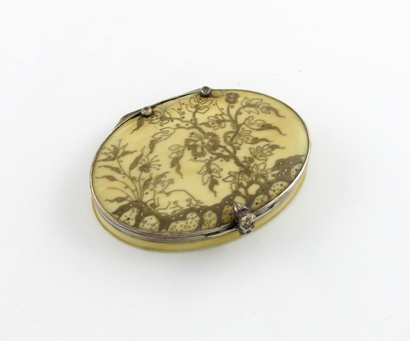 the cover decorated with a stag resting under a tree, with reeded silver hinge mount and an unusual seated lion thumb-piece, the base with piqué leaf motif, length 8.8cm..