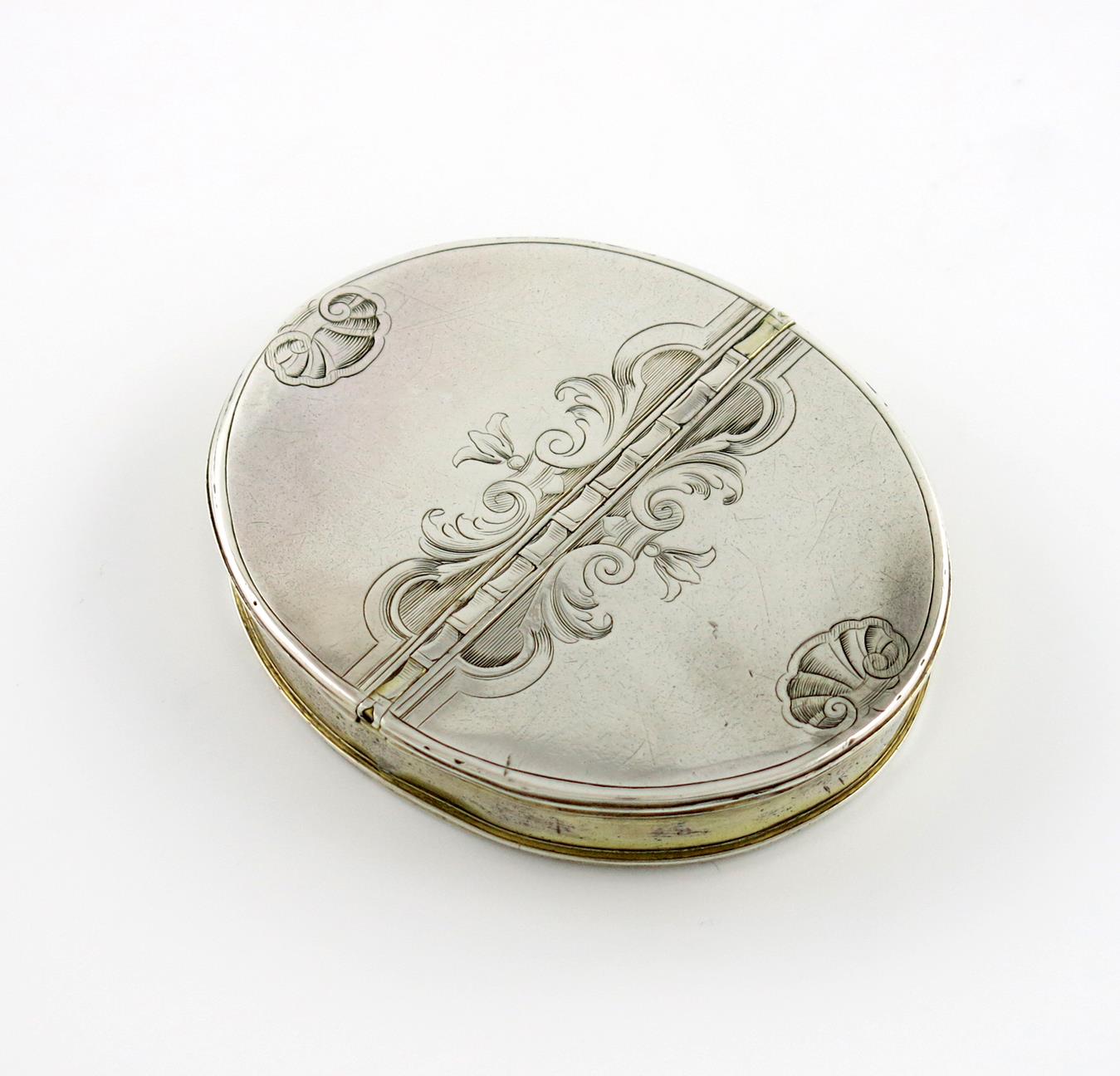 oval form, with two flush hinged covers with engraved scroll and shell decoration, gilded interior, the sides with traces of gilding, length 7.5cm, approx. weight 2.6oz.,