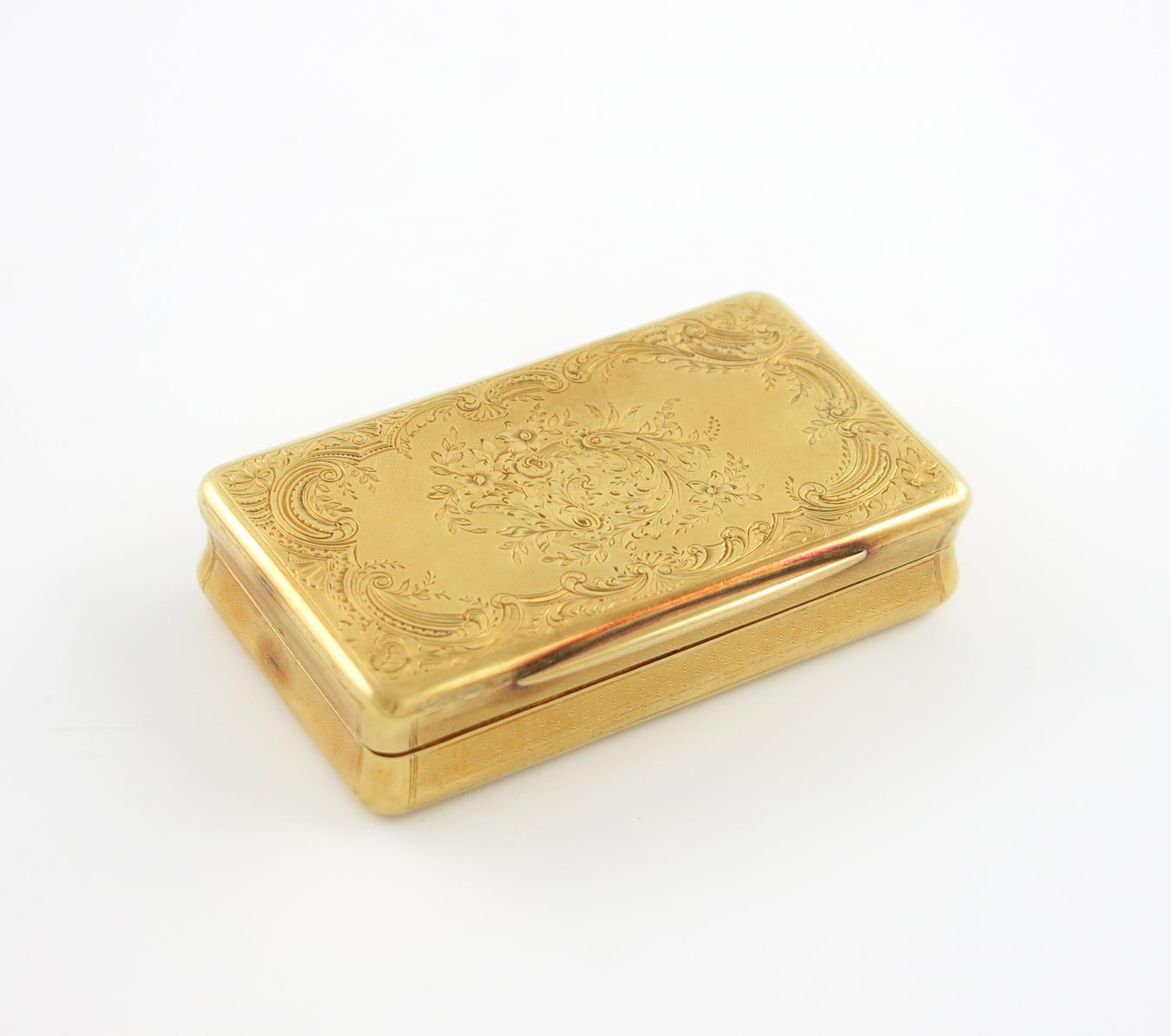rectangular form, the cover engraved with flowers and foliate scroll decoration, on an engine-turned ground, the base with similar decoration, engine-turned sides, length 7.4cm, approx. weight 67.7g.