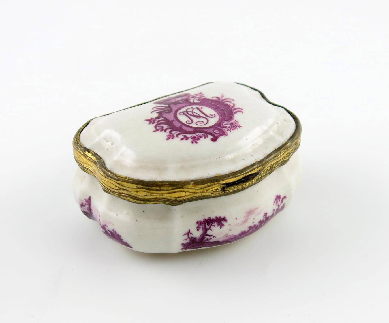c.1770, of bombé shape, the inside cover painted perhaps by Johann Andreas Oest with a half-portrait of Marie Sophie Wilhemine von Württemberg-Oels, seated on a red velvet chair with a gilt crown mount, wearing a purple dress trimmed with lace, and the Order of Württemberg-Oels, a small cat seated on her lap, the shaped sides and base with purpurmalerei decoration of landscape vignettes, the cover with the monogrammed initials MS within a crowned oval cartouche, gilt metal mounts, 8.2cm across.