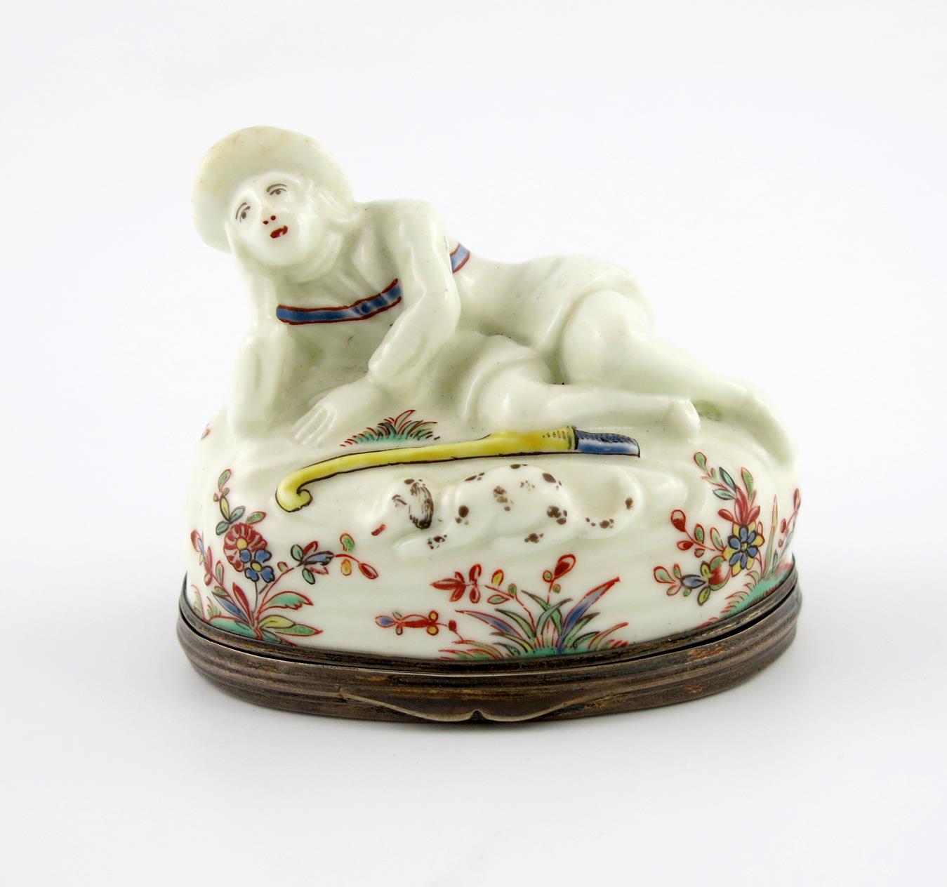 c.1740, modelled as a reclining shepherd, resting his head on his right hand, his crook and his dog lying on the ground beside him, the tall oval base decorated with sprays of Kakiemon flowers, with similar sprays painted to both sides of the flat base, 7.6cm across.