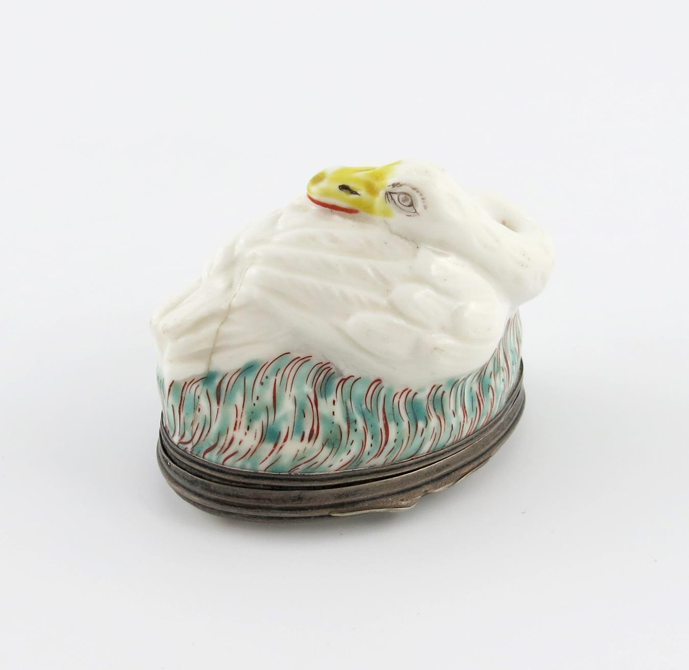 c.1745, modelled as a swan or goose, resting its chin on its furled wings, raised on a base of reeds picked out in red and turquoise, the hinged oval lid painted in a simple palette with a Chinese figure holding a parasol beneath a palm tree, the interior with flying insects and Oriental flower sprays, the silver mount with a discharge mark for Antoine Leschaudel, c.1744-50, 6.5cm across.