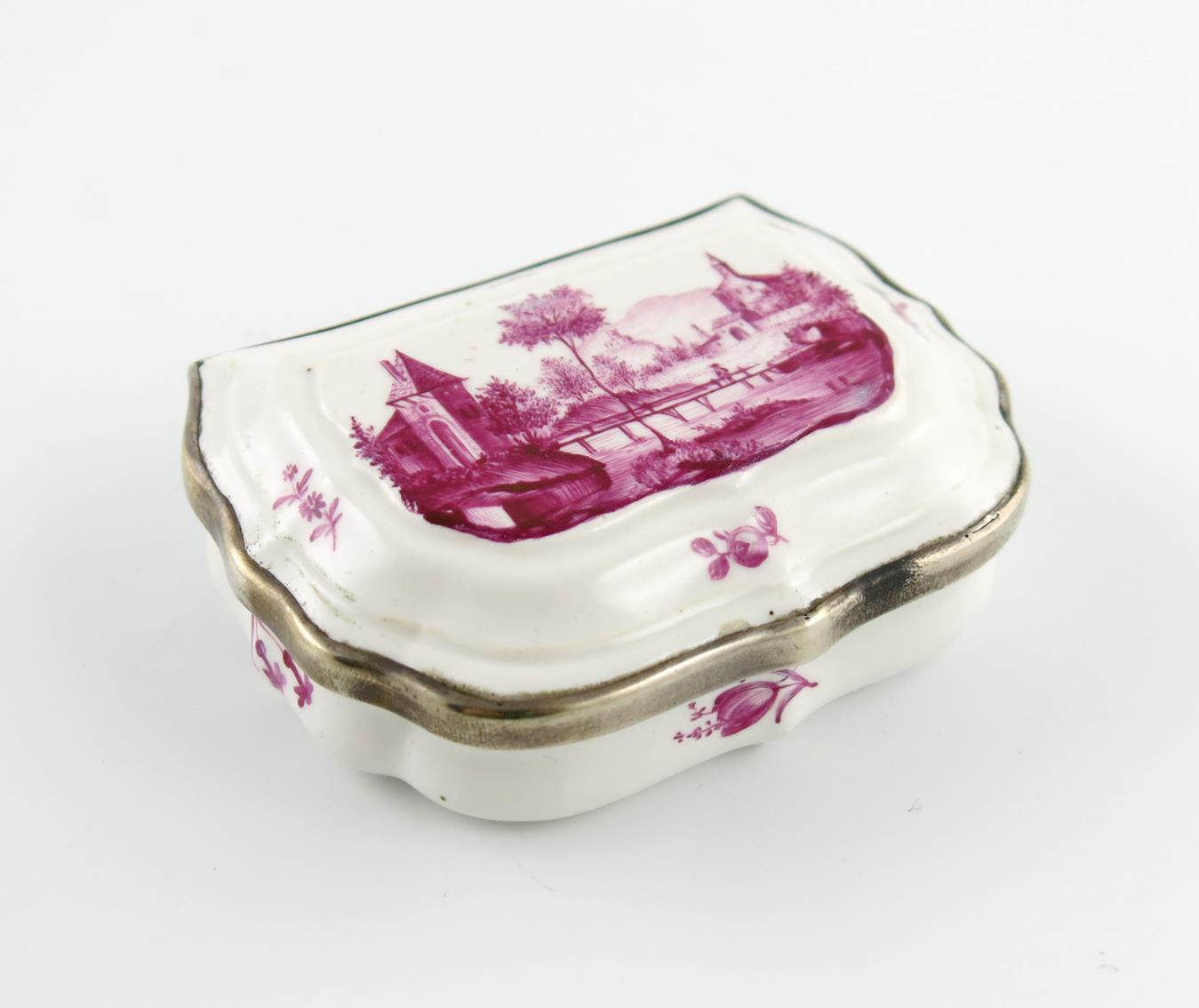 18th century, possibly Fürstenberg, the moulded cover decorated in purpumalerei with a figure crossing a bridge in a European village landscape, the base with a further figure leaning on a spade with mountains beyond, the shaped sides with small flower sprigs, later metal mount, 8cm across.