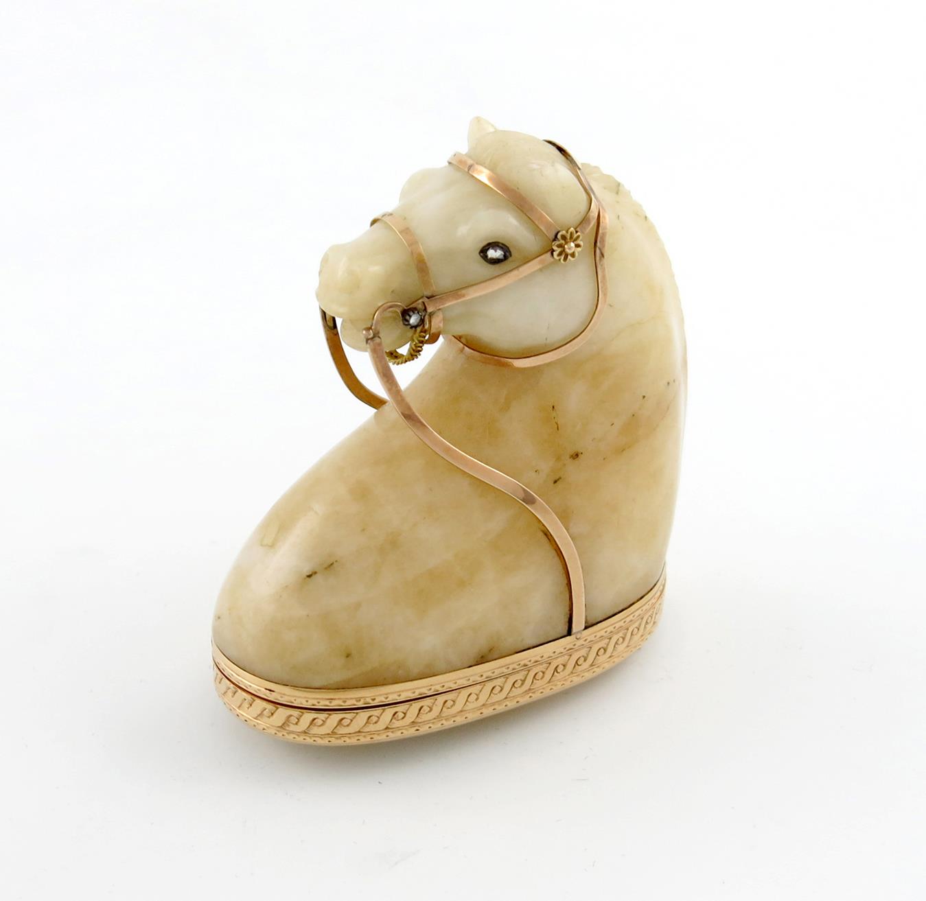 the shaped-oval quartz cover with gold hinge mount decorated with a guilloche band on a base carved as the head of a horse with diamond-set eyes and gold bridle with diamond tips to the bit, height 7.5cm, length 6.8cm.