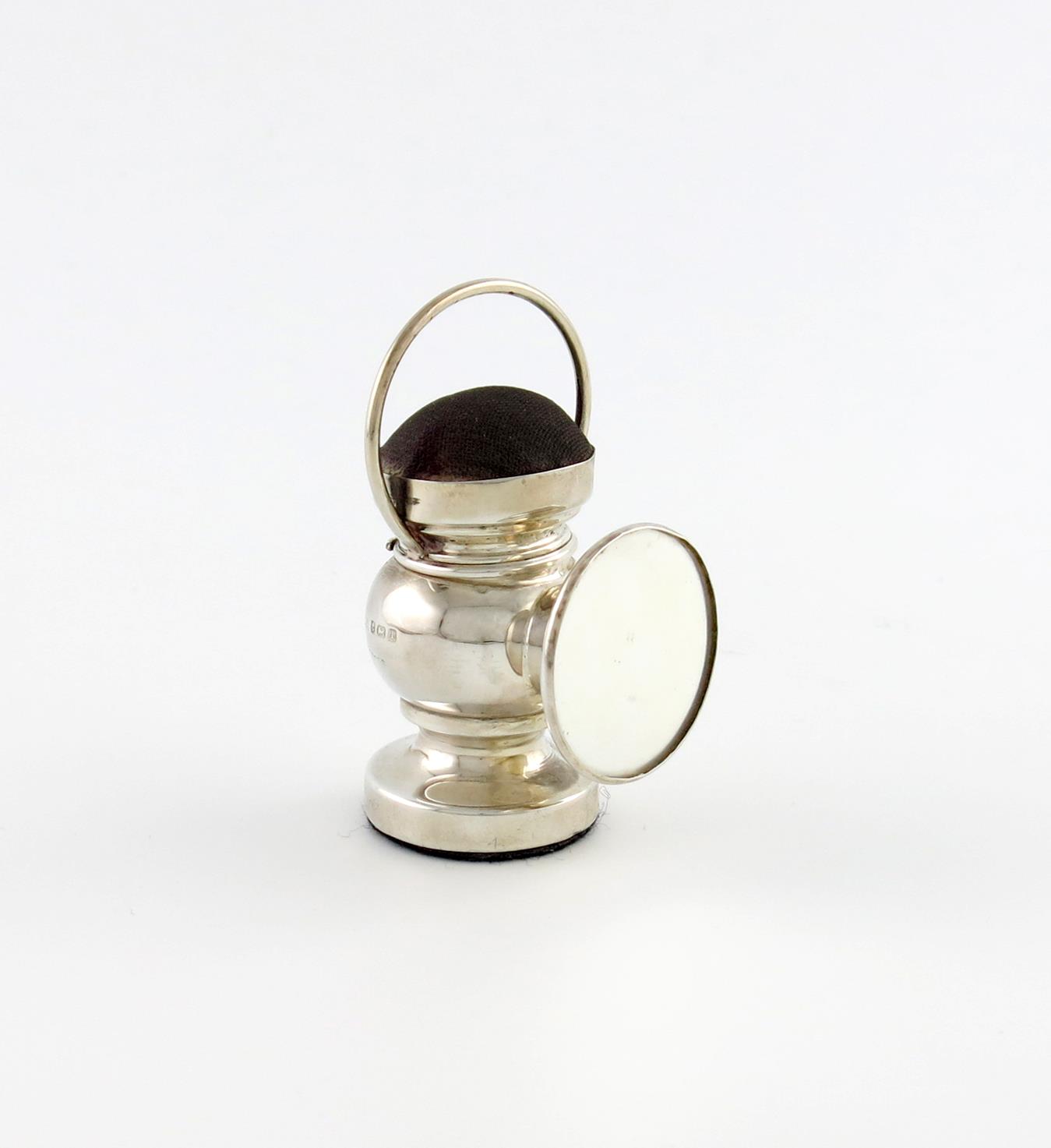 modelled as a lantern, the hinged cover with a carrying handle and cushion, the front with a mirror, on a circular foot, height 7cm.