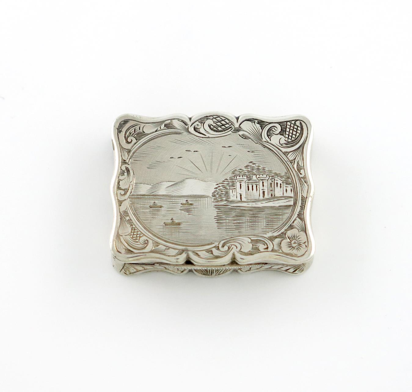 shaped rectangular form, the hinged cover with a lake scene, with boats to the left, a castle to the right and hills behind, the sides and base with engraved foliate scroll decoration, the base with an initialled cartouche, the interior with a pierced and engraved silver-gilt grille, length 3.5cm, approx. weight 0.6oz.