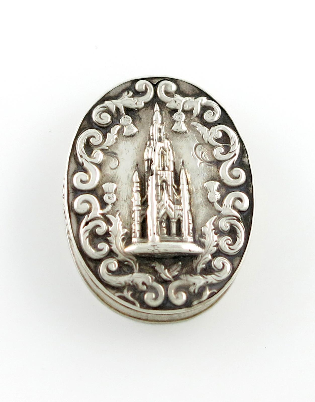 oval form, the hinged cover with a raised scene of the Memorial, reeded sides and base with engraved tartan scroll decoration, the base with a vacant cartouche, the interior with a pierced and engraved silver-gilt grille, length 5cm, approx. weight 1.1oz.