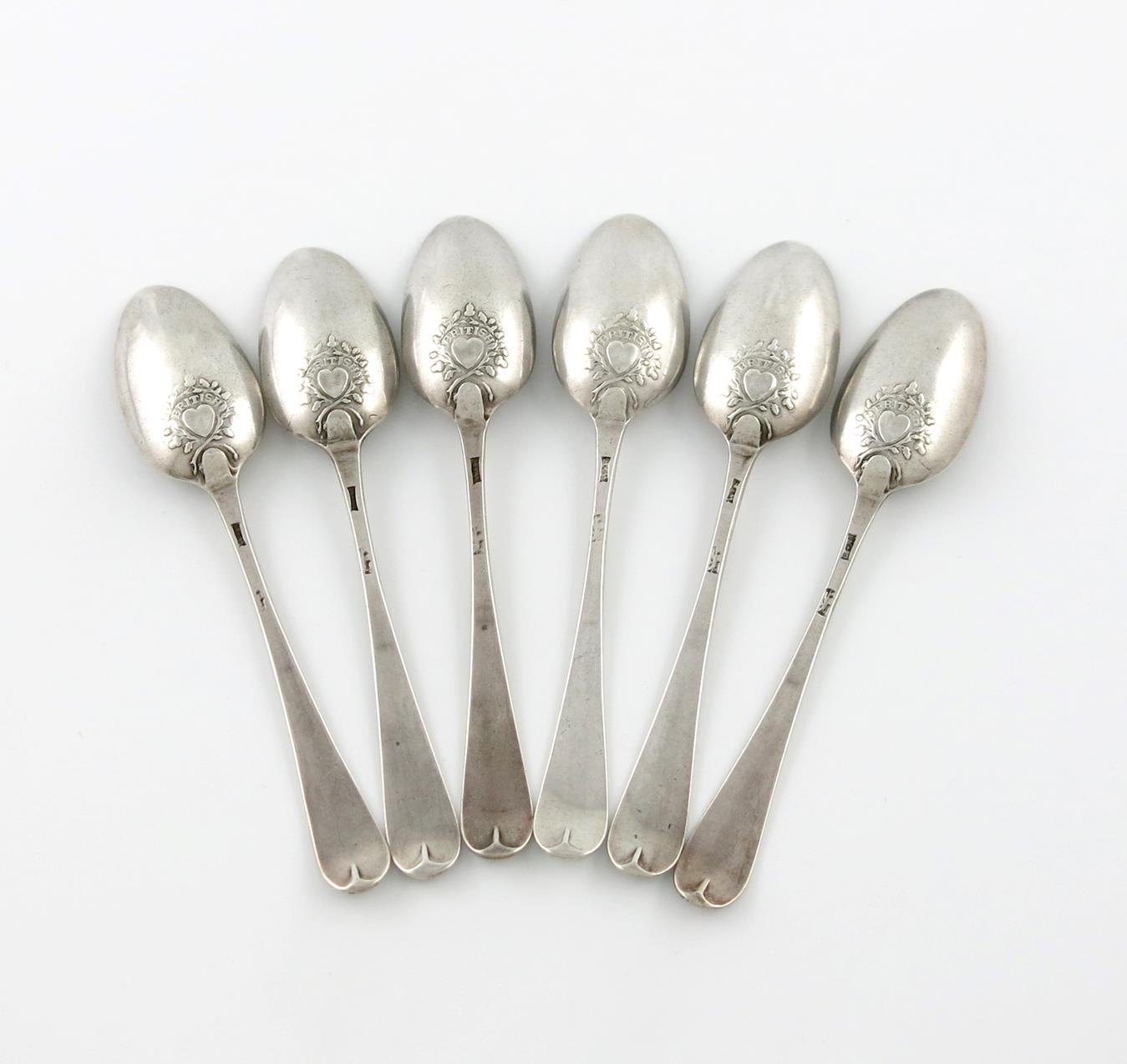 A set of six George III silver old English pattern 'picture-back' teaspoons,