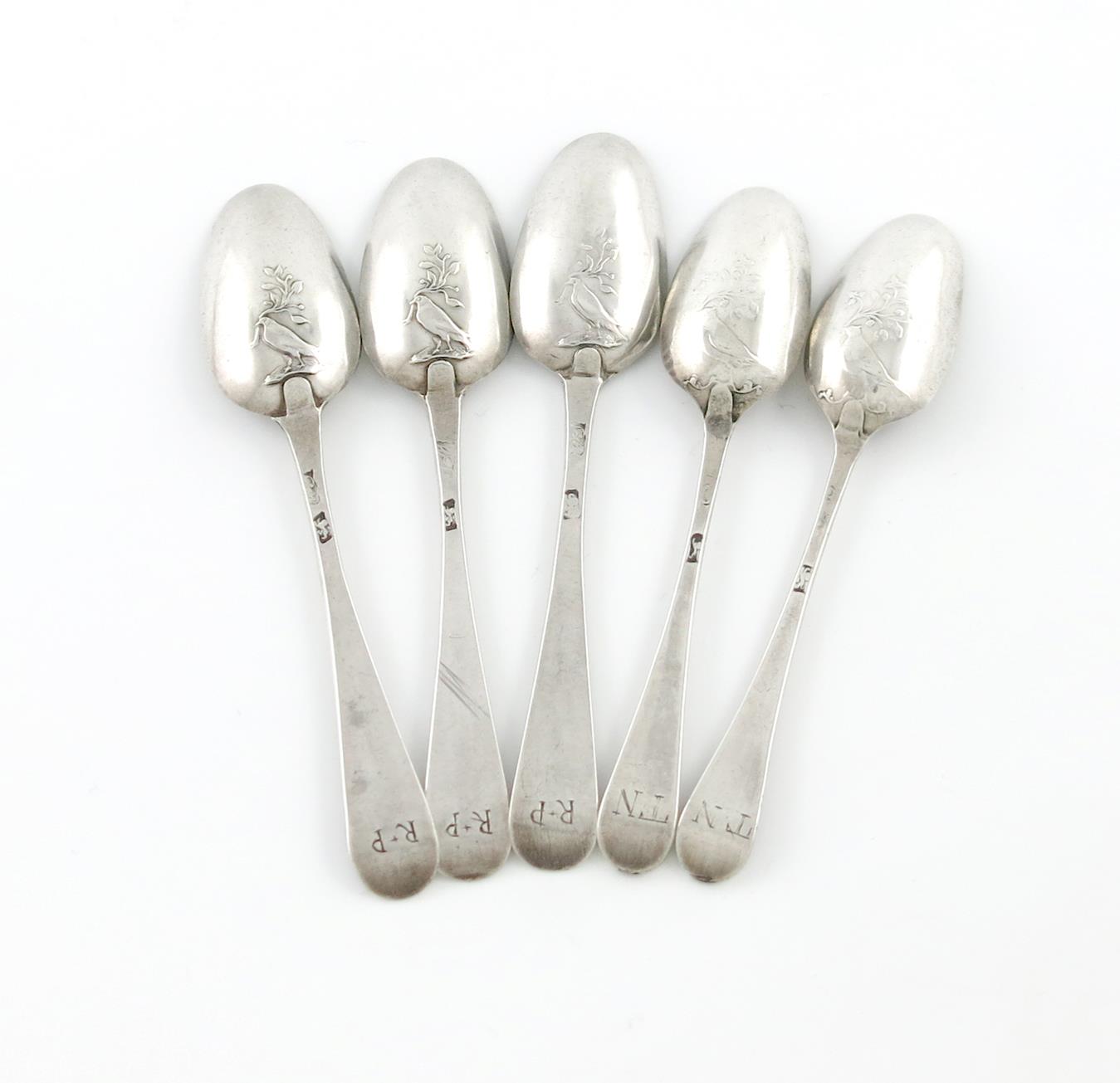 A set of five George III silver Hanoverian pattern 'picture-back' teaspoons