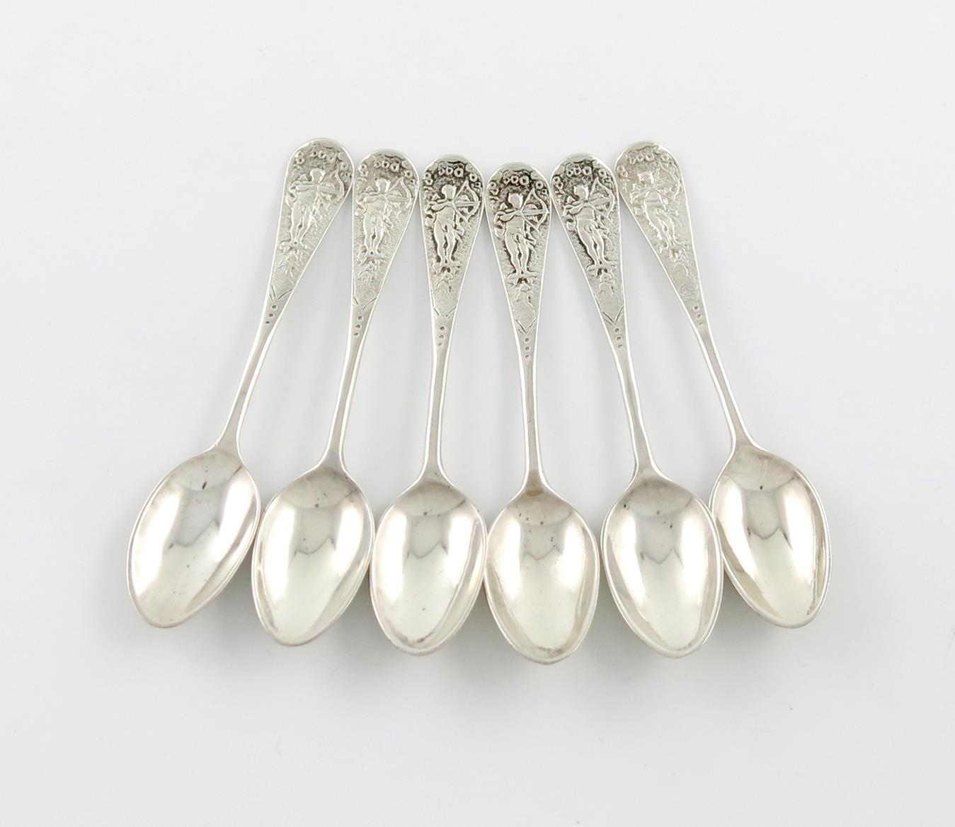 the terminals with cupid firing an arrow, the reverse of the bowl with scroll decoration, approx. weight 3.3oz. (6)