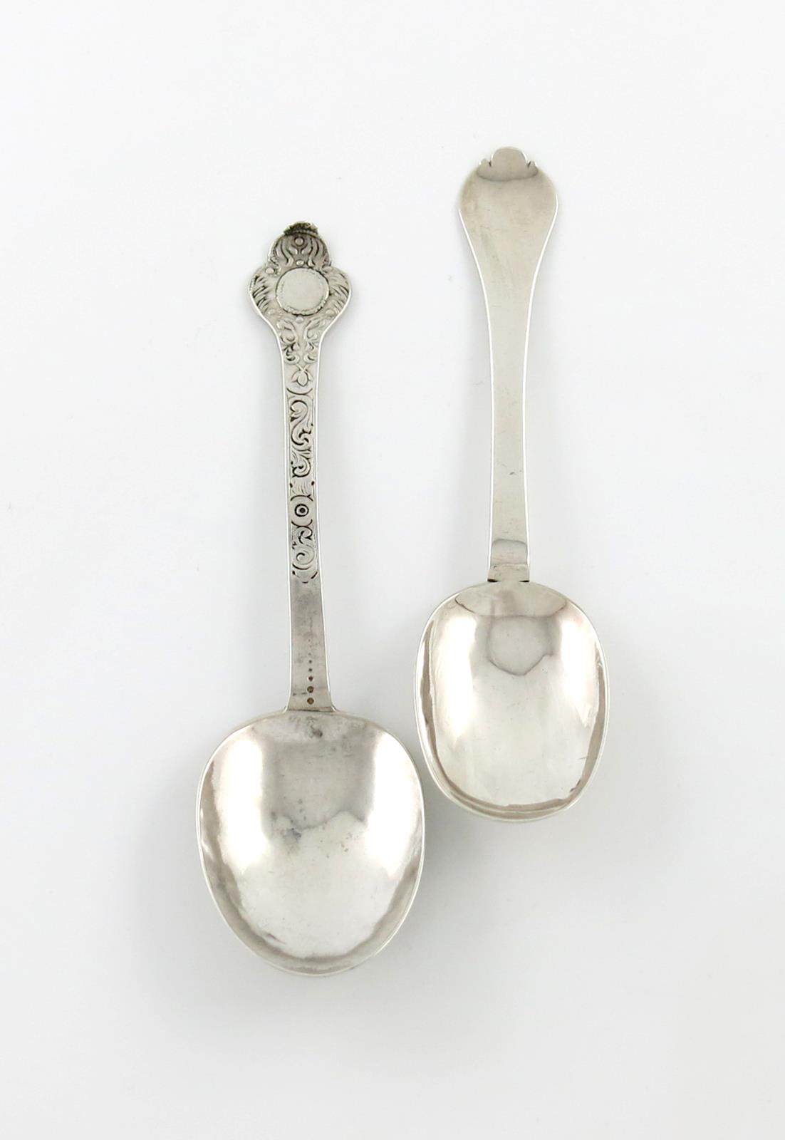 the reverse of the oval bowl with a raised decoration, later foliate decoration, length 20.5cm, plus William III silver Trefid spoon, marks worn, London 1698, approx. total weight 3.4oz. (2)