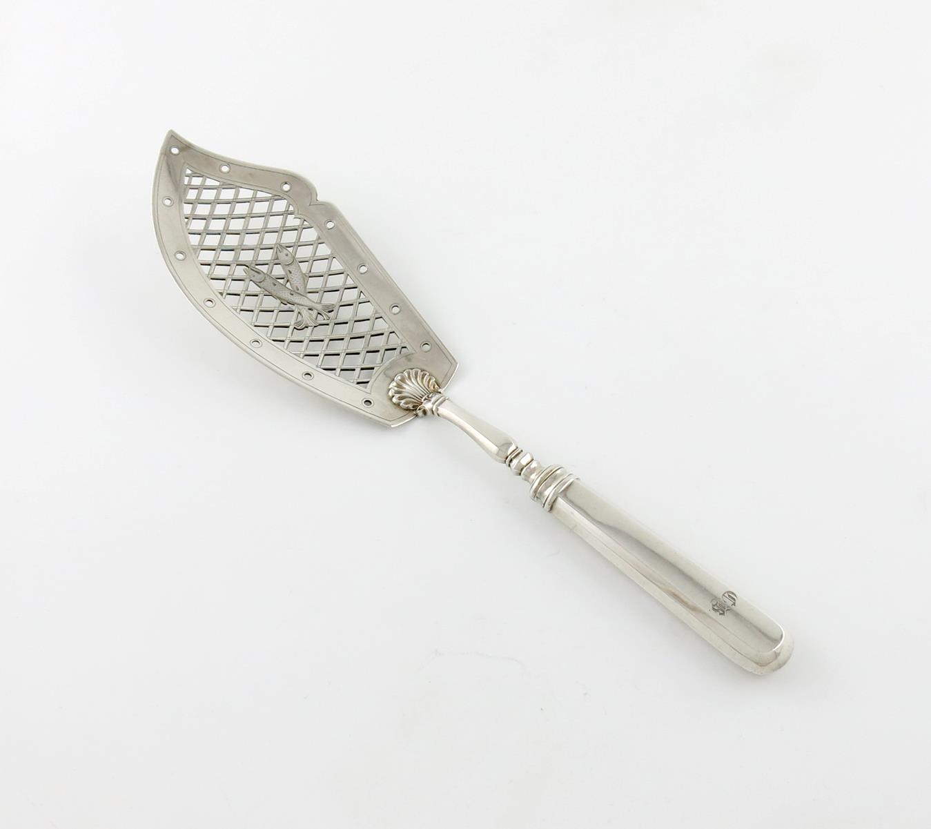 the blade with pierced and engraved trellis decoration, tapering faceted handle, initialled, length 32.3cm.