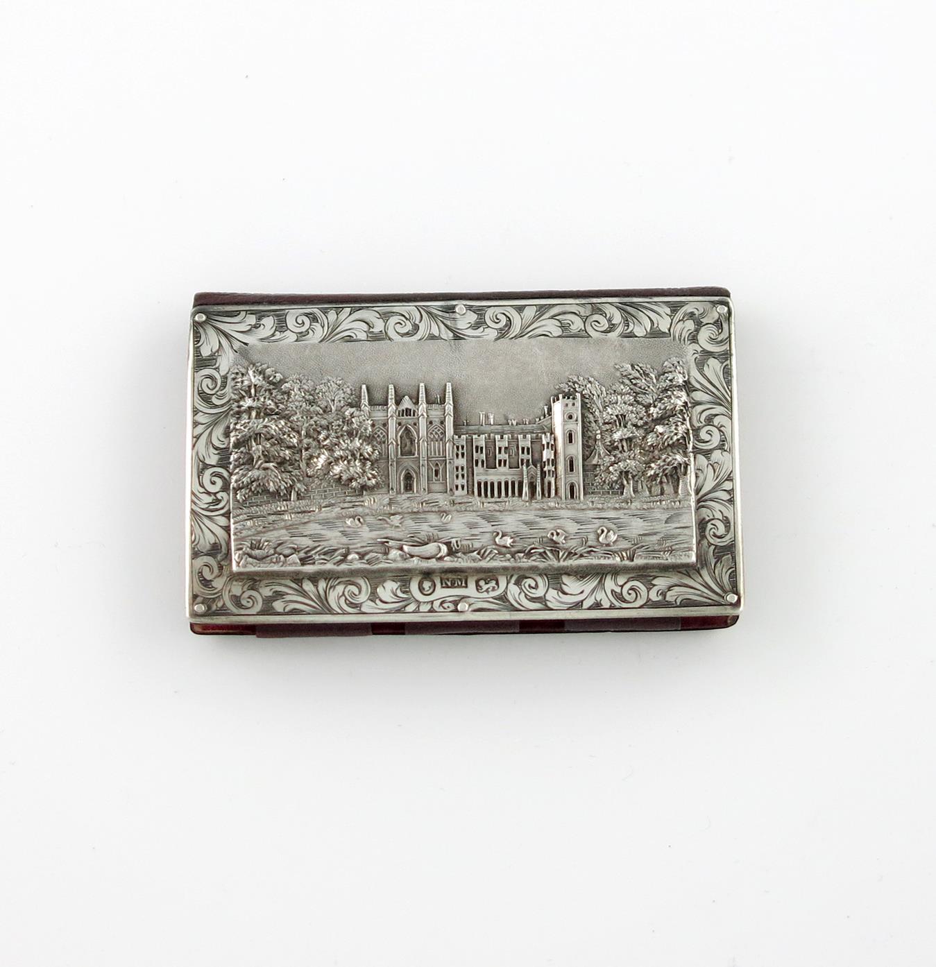 rectangular form, the front and back with a raised scene of the Abbey and Castle, on a matted background, within a foliate scroll border, the interior with ivory leaves, length 8cm.