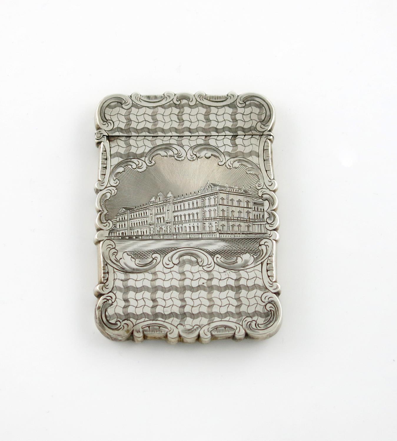 A Victorian silver engraved 'castle-top' card case, Buckingham Palace,