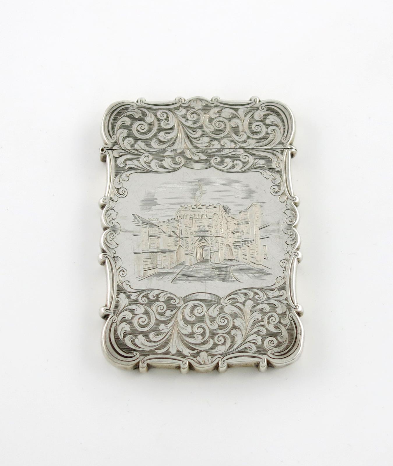 A Victorian silver engraved 'castle-top' card case, Bar Gate, Southampton,