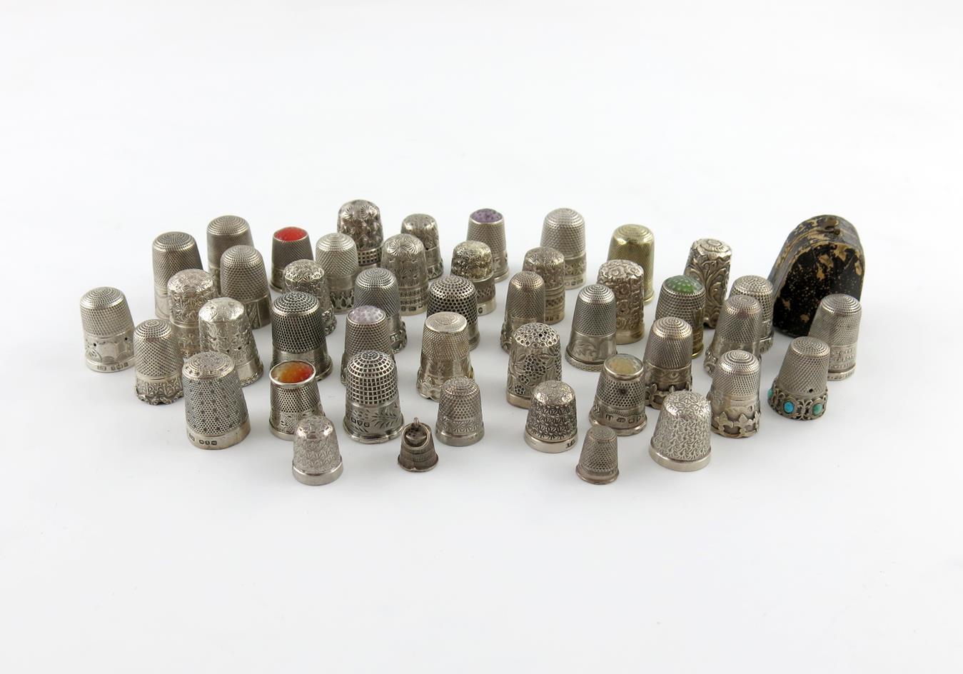 A collection of forty-five silver, metalware and electroplated thimbles,