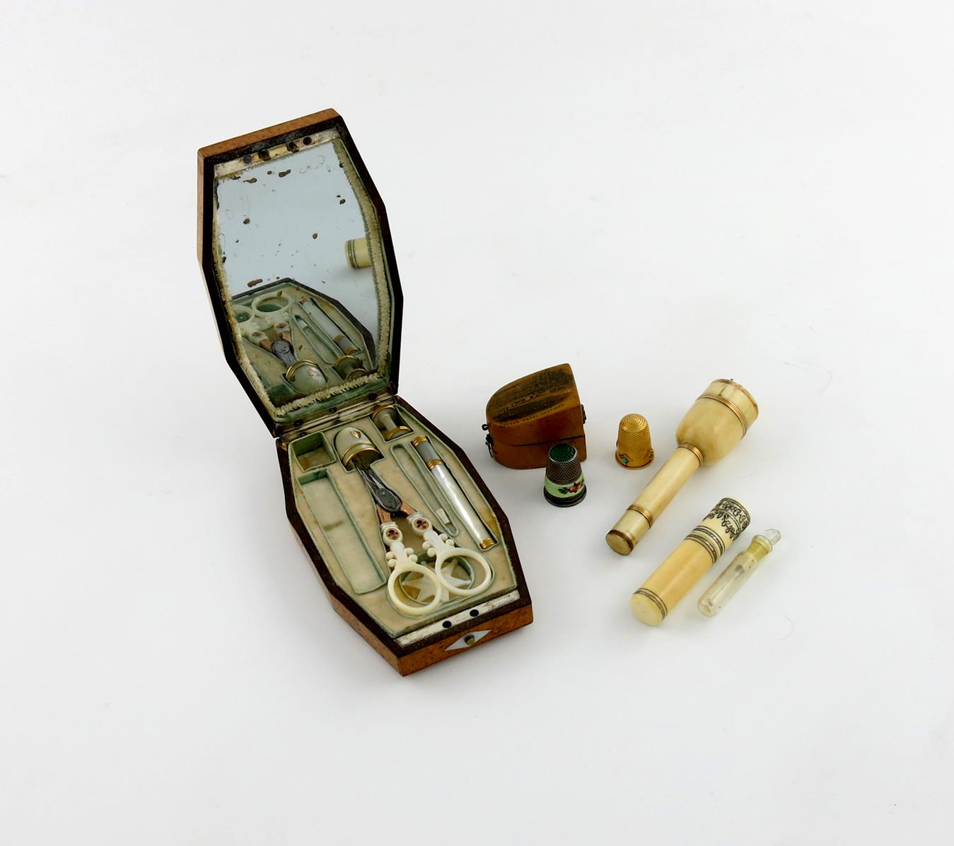 comprising: a Victorian unmarked gold gem set thimble, a 19th century gold-mounted ivory thimble / needle case, a 19th century gold and mother-of pearl sewing set, some damage, and some pieces missing, in a fitted wooden case, a Mauchline ware thimble case with a scene of the Queen's Hotel Hastings, a silver and enamel thimble and a 19th century ivory scent bottle case with a glass scent bottle. (6)