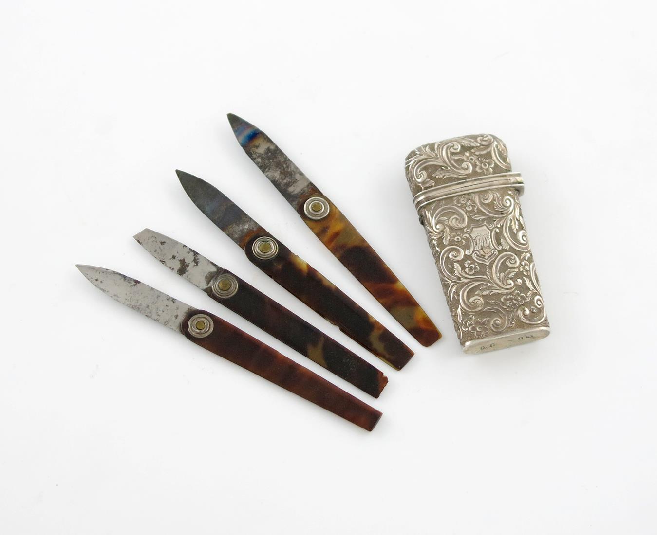 tapering oblong form, embossed foliate scroll decoration, the hinged cover opens to reveal four lancets, initialled, length 6.4cm, approx. weight 0.7oz.