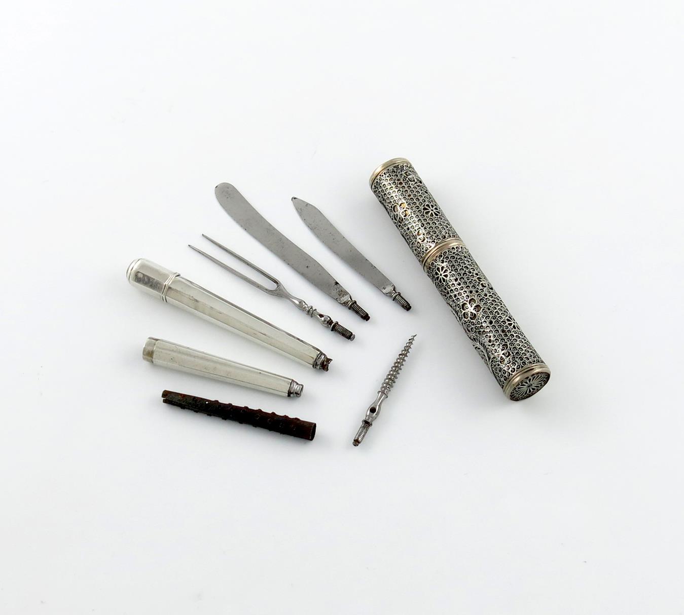 comprising: two tapering knife/fork handles, one with a cover, a screw-in steel two pronged fork and two knife blades, a metal rasp and a corkscrew, in a fitted cylindrical filigree covered case, with a pull-off cover, length 9.9cm.