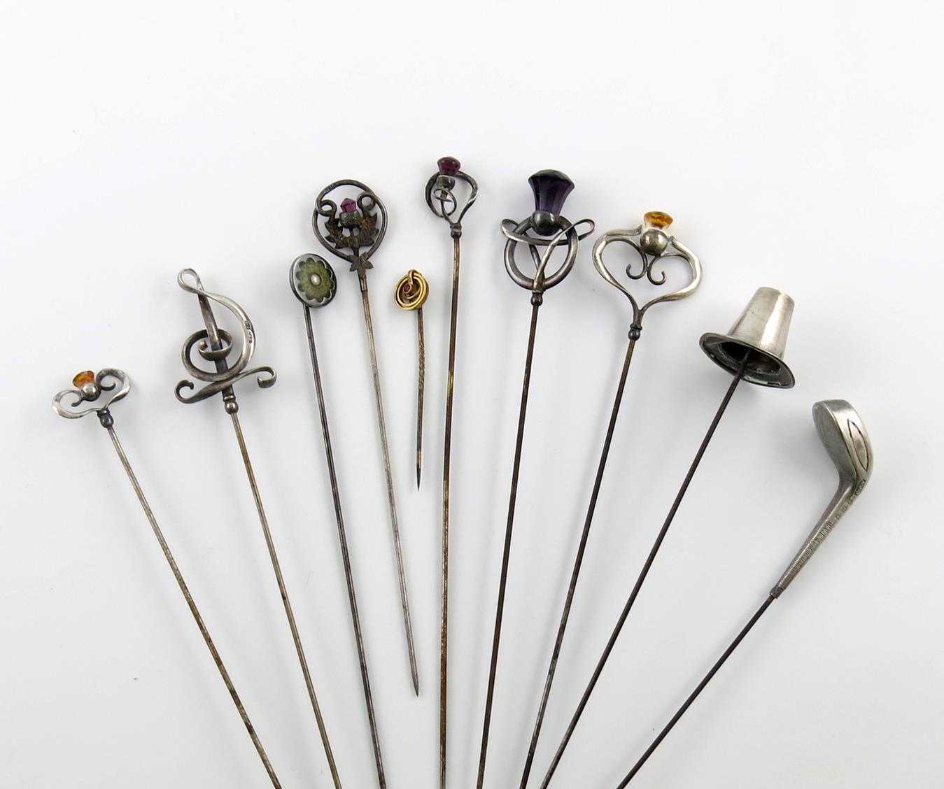comprising: a silver one modelled as a Welsh hat, by Charles Horner, Chester 1909, five further ones by Charles Horner, plus one modelled as a golf club, by Arthur Smith, Birmingham 1908, two others and a gold tie pin. (10)