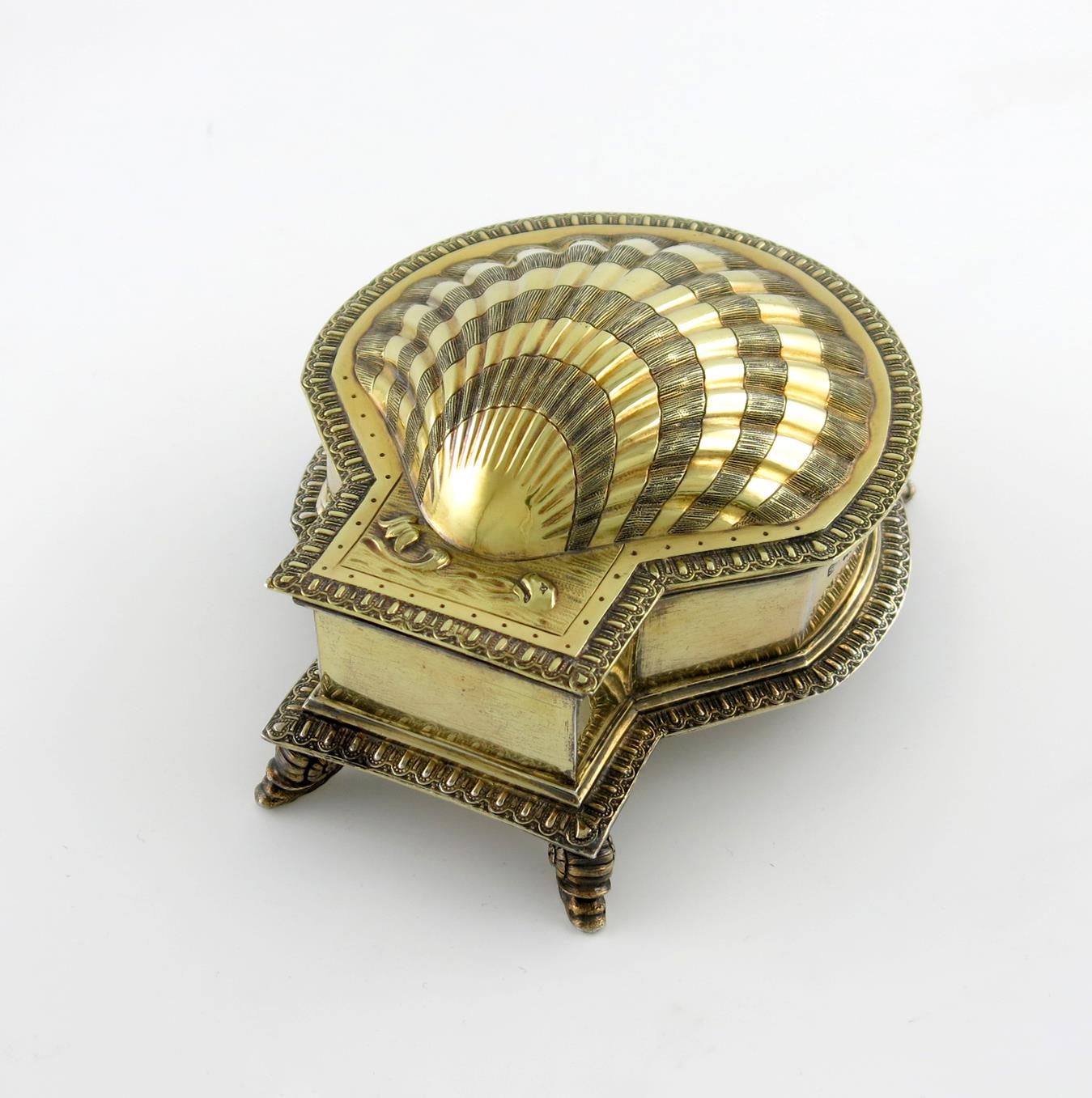 modelled as a spice box, shell form, chased decoration, the hinged cover opens to reveal an inkwell with a glass liner and a compartment, on four snail feet, length 14.5cm, approx. weight 19.5oz.