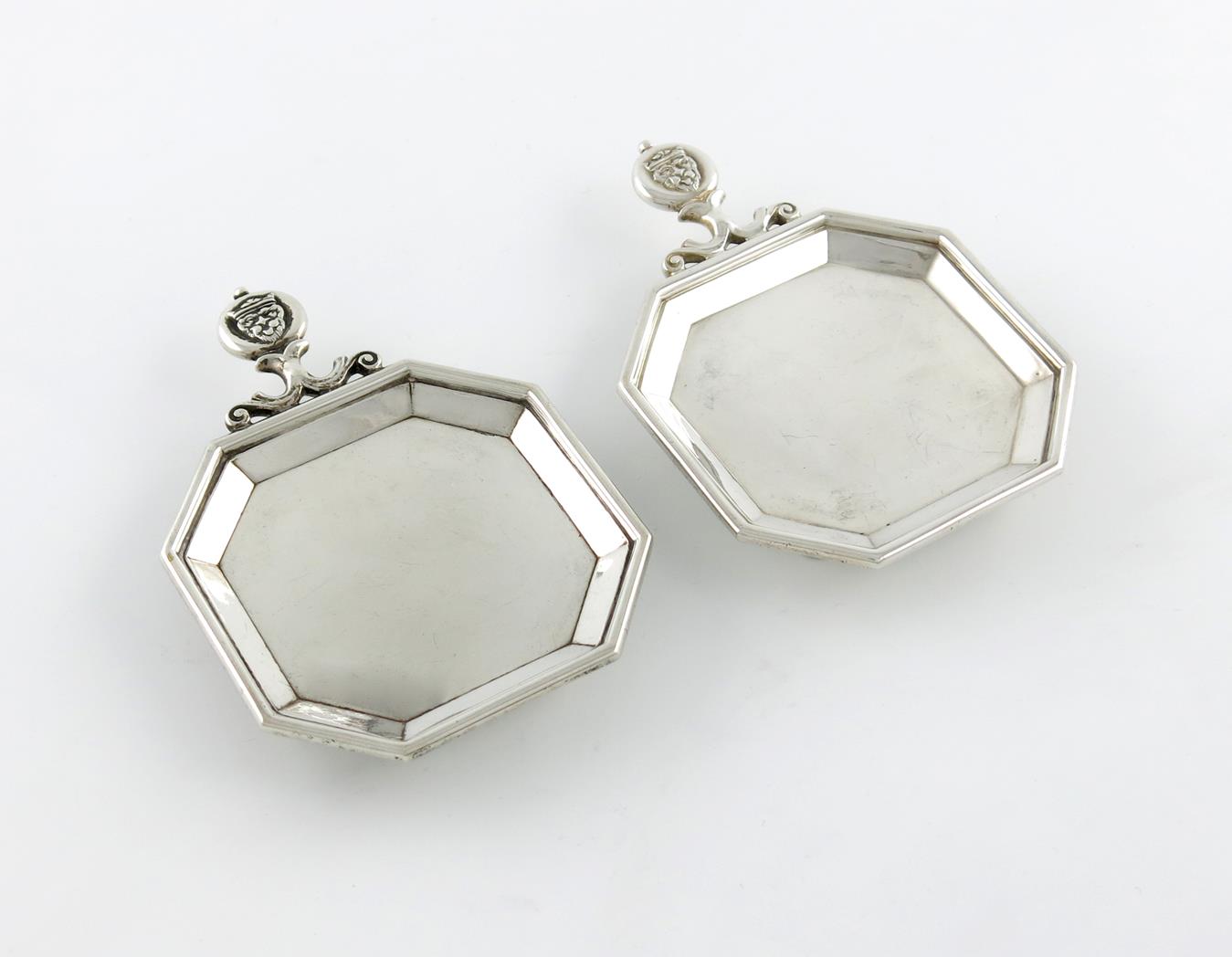 octagonal form, moulded border, the handles with a crowned leopard's head, on four bun feet, the underside inscribed, 'Goldsmiths Hall, First Dinner for Ladies, 20 November 1929', length 12.3cm, approx. weight 6.5oz. (2)