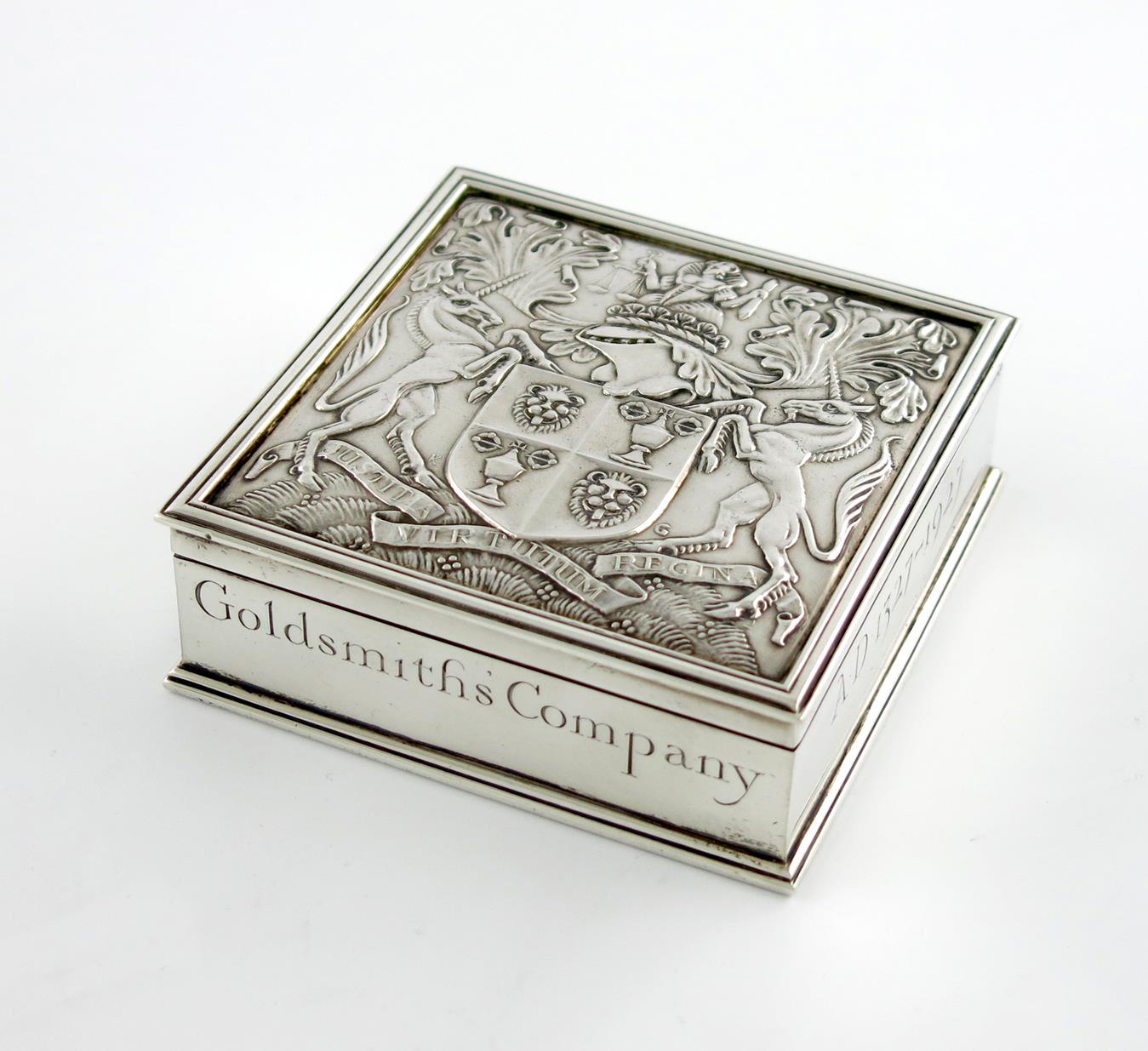 square form, the cover with the arms of the Company, the side inscribed 'The Gift of the Goldsmiths Company AD 1327-1927', wood lined base, length 9.4cm.