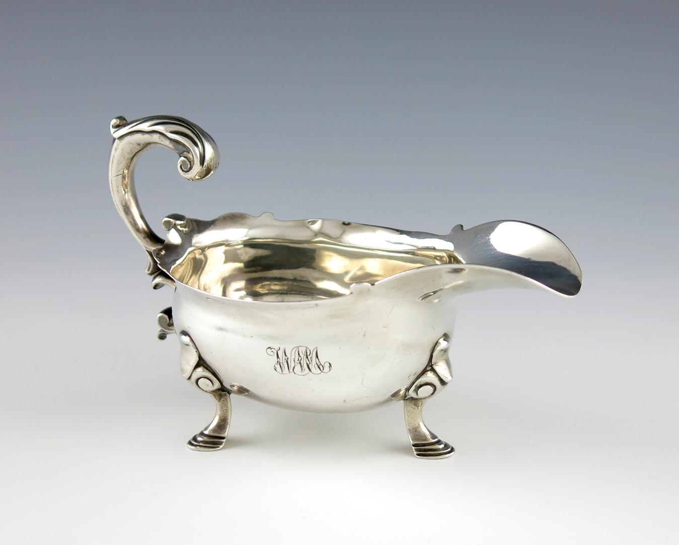 oval form, wavy-edge border, leaf capped scroll handle, on three hoof feet, length 16.5cm, approx. weight 7.5oz.