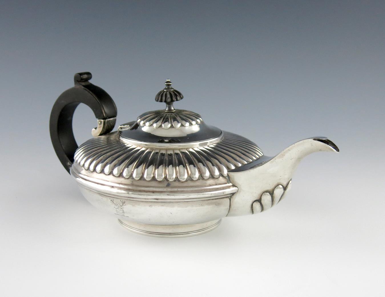 compressed circular form, part fluted decoration, fluted hinged cover with a fluted finial, scroll handle, engraved with a crest, length handle to spout 17.8cm, approx. weight 17.7oz.