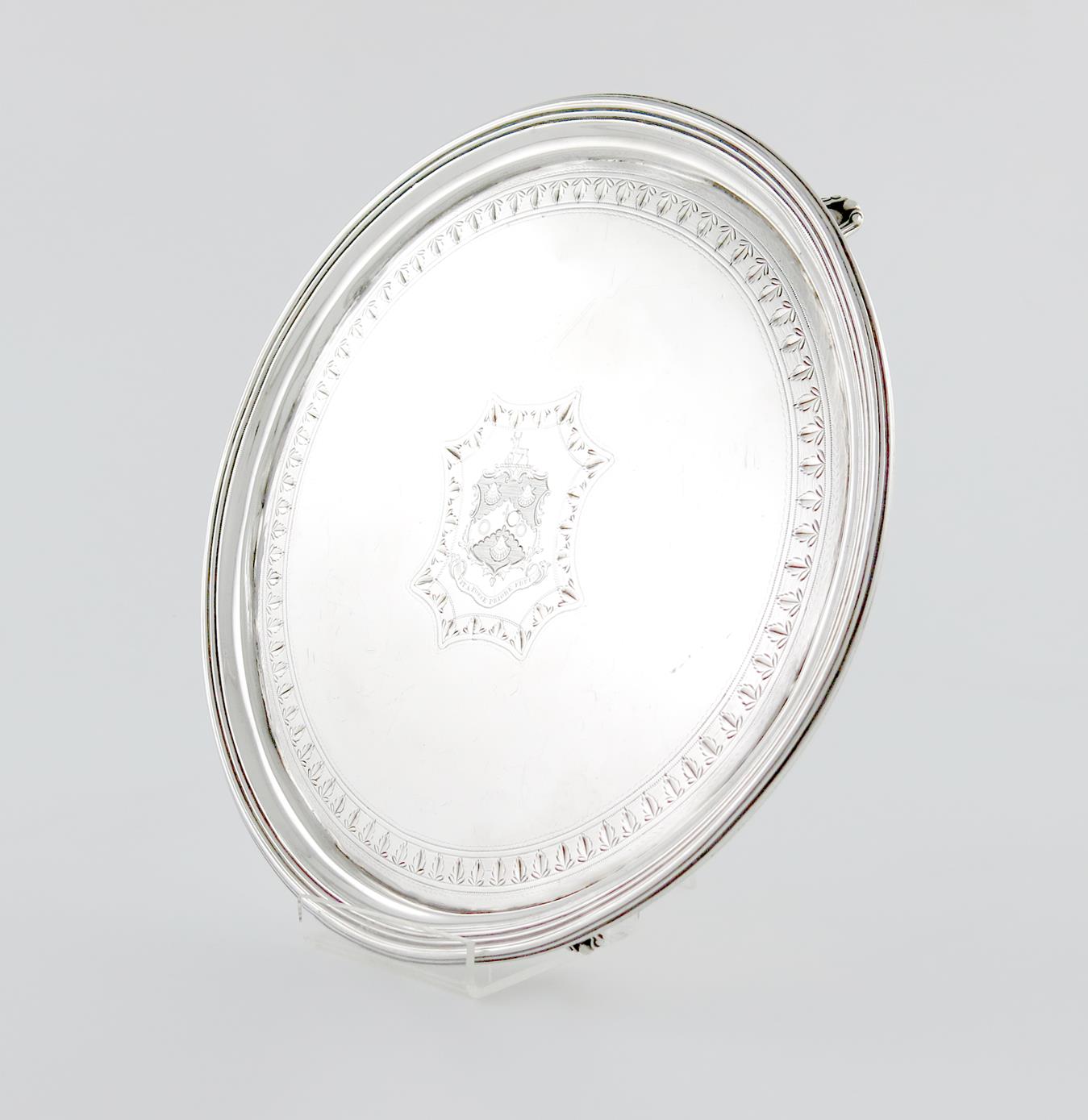 circular form, moulded border, the centre with engraved decoration, engraved with an armorial, on three bracket feet, diameter 25.4cm, approx. weight 18.3oz.