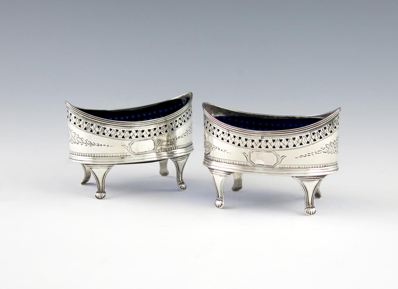 oval form, pierced and engraved decoration, on four bracket feet, with blue glass liners, length 8.3cm, approx. weight 2.5oz. (2)