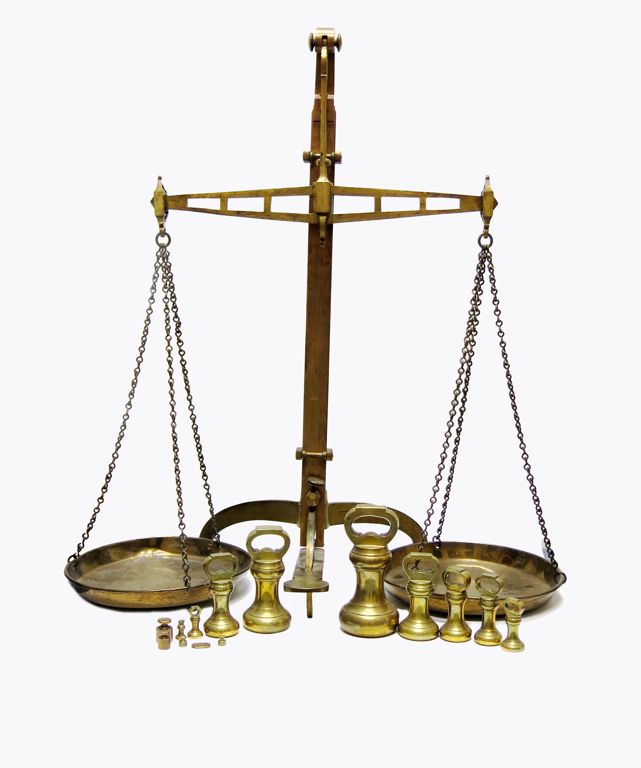 with a foot pedal lifting mechanism, with two circular dishes, with the following Troy weights: 200, 100, 50, 40, 30, 20, 10, 5, 3, 2, 1, 1/2 (x2) and 10 penny weights, height 107cm.