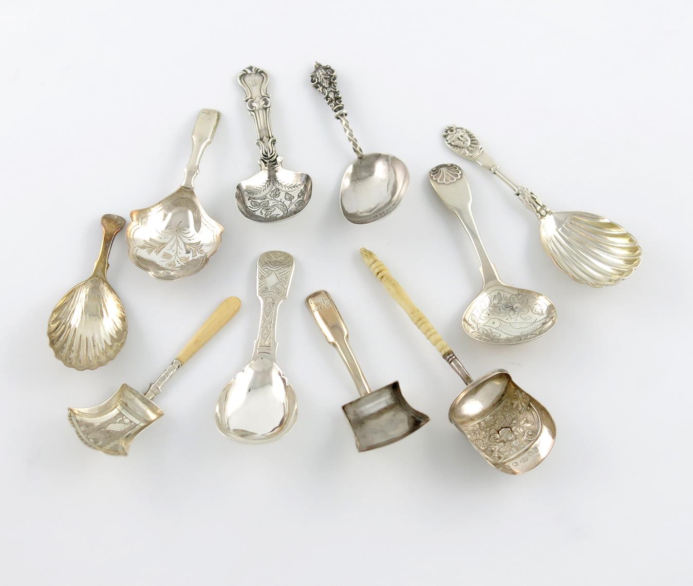 comprising: one with a foliate shovel bowl, and turned bone handle, by Joseph Willmore, Birmingham 1816, one with a shaped bowl and foliate decoration, by Hilliard and Thomason, 1878, plus one with an ivory handle, by Joseph Taylor, Birmingham 1816, plus seven various examples, approx. weight 3.6oz. (10)