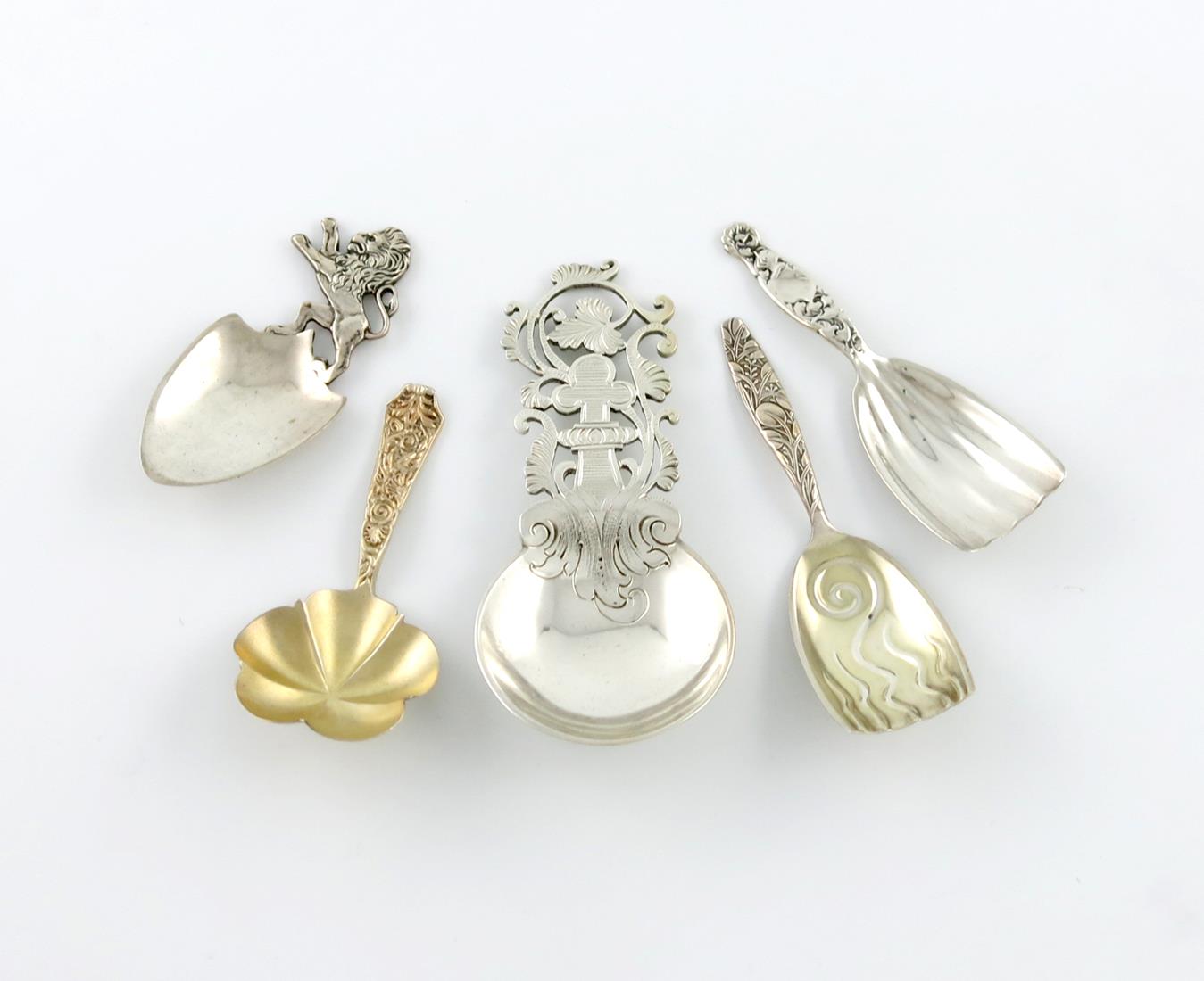 comprising: one by Shreve, Crump and Low, large circular bowl, pierced and engraved foliate scroll handle, length 11.2cm, plus a silver-gilt spoon, with a shaped circular bowl, plus one with a lion handle and shield shaped bowl, and two others, approx. weight 4.3oz. (5)