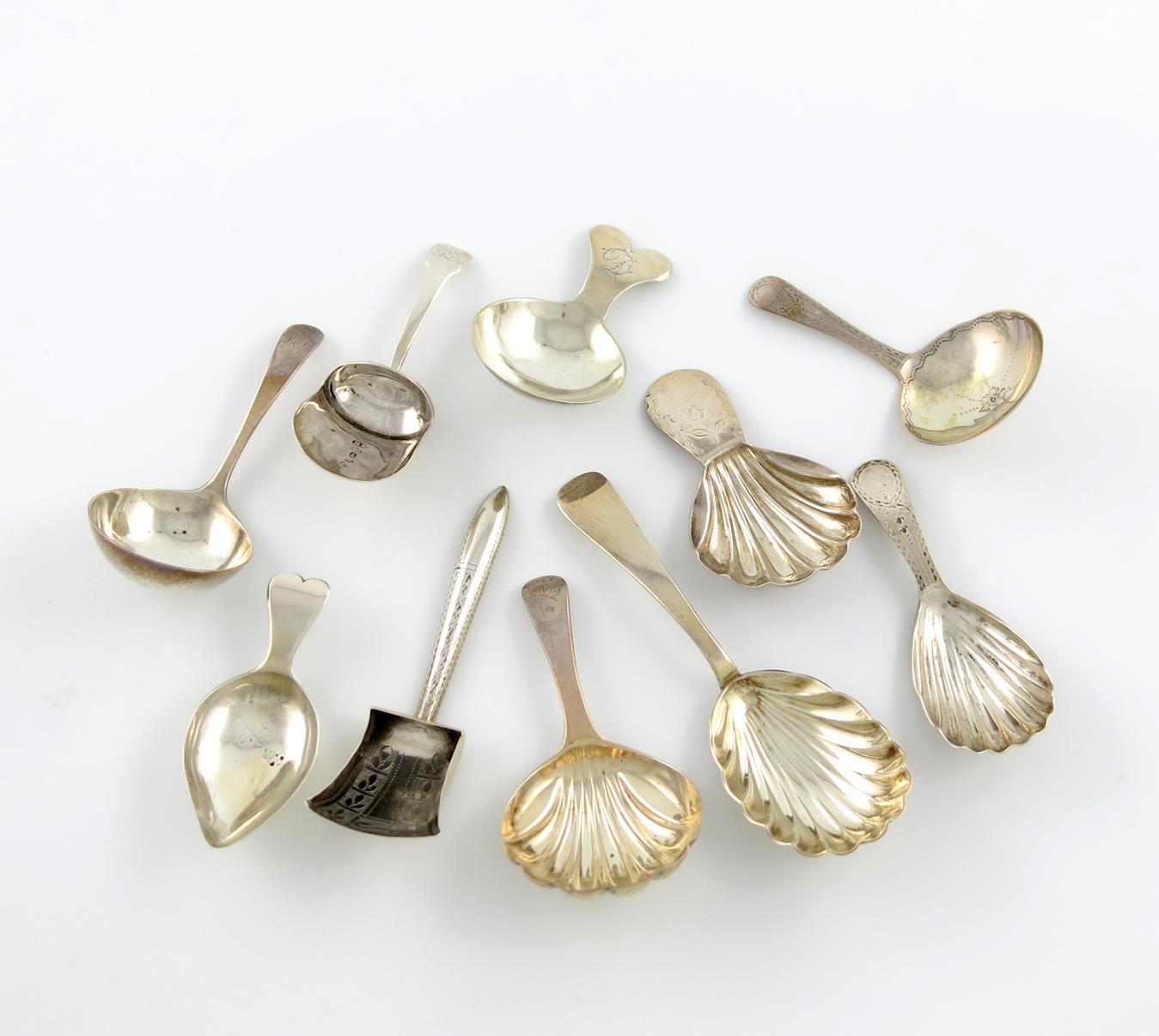 comprising: one with an engraved shovel bowl, by Joseph Taylor, Birmingham 1811, one with a leaf shaped bowl, by William Pugh, Birmingham 1810, plus four with fluted bowls, one with a rounded 'fish-tale' handle, London 1812, and three others, approx. weight 3.5oz. (10)