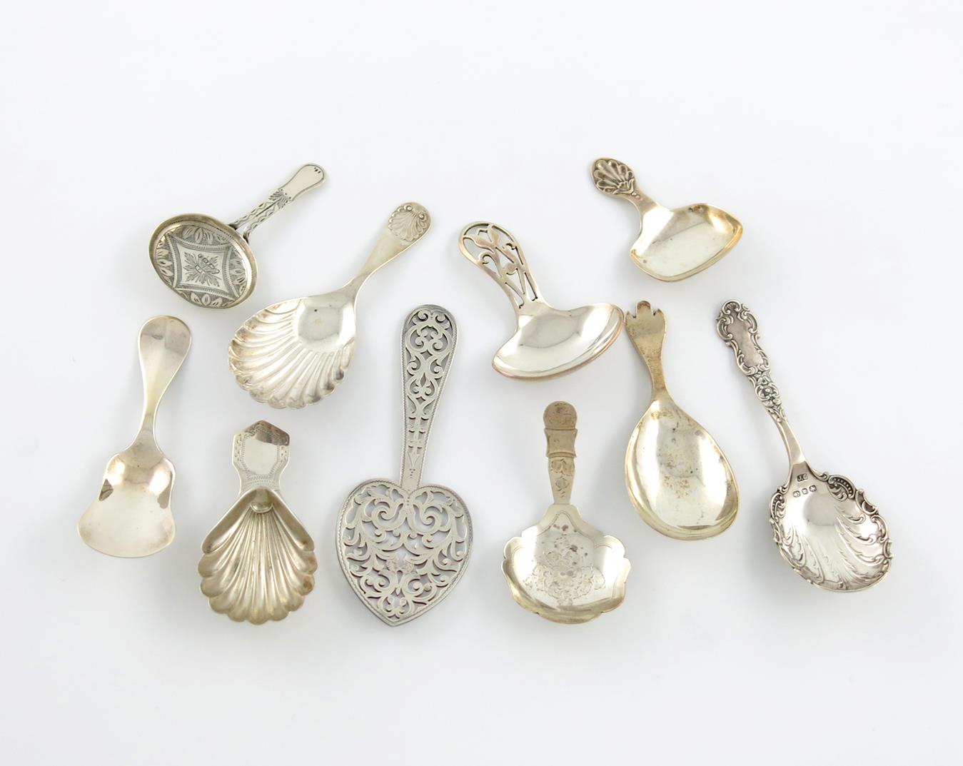 comprising: one with a Trefid terminal, by Mappin and Webb, London 1912, one with an oval bowl, and pierced handle, plus a one of heart form, with a pierced bowl and handle, Birmingham 1891, plus seven various, approx. weight 4.5oz. (10)