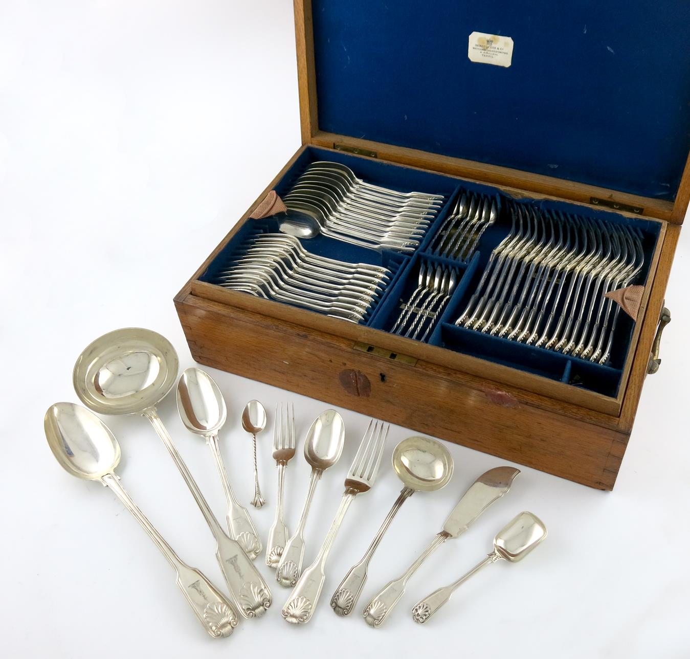 A Victorian silver Fiddle, Thread and Shell pattern canteen for twelve,