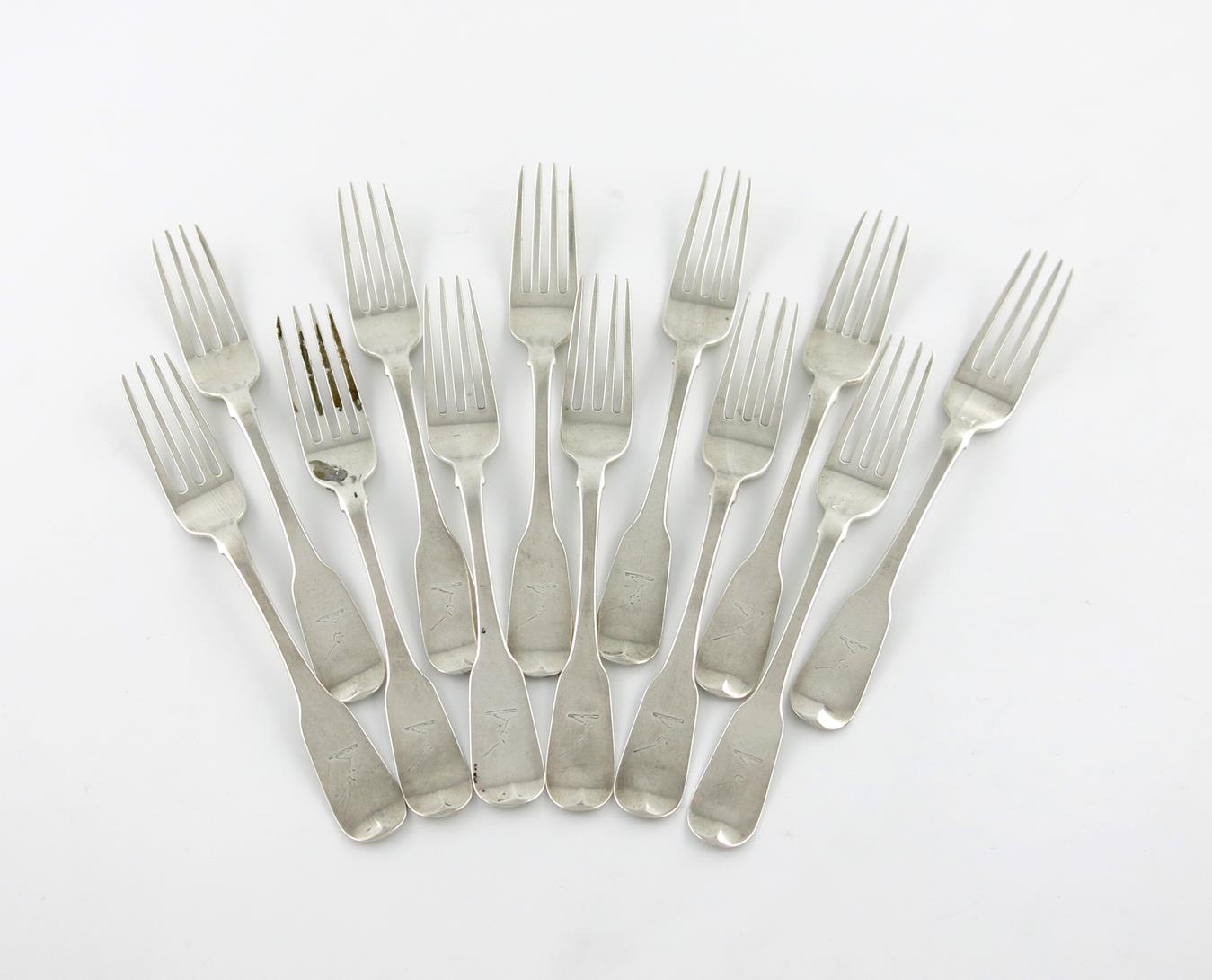 A set of twelve George III Irish silver Fiddle pattern dessert forks