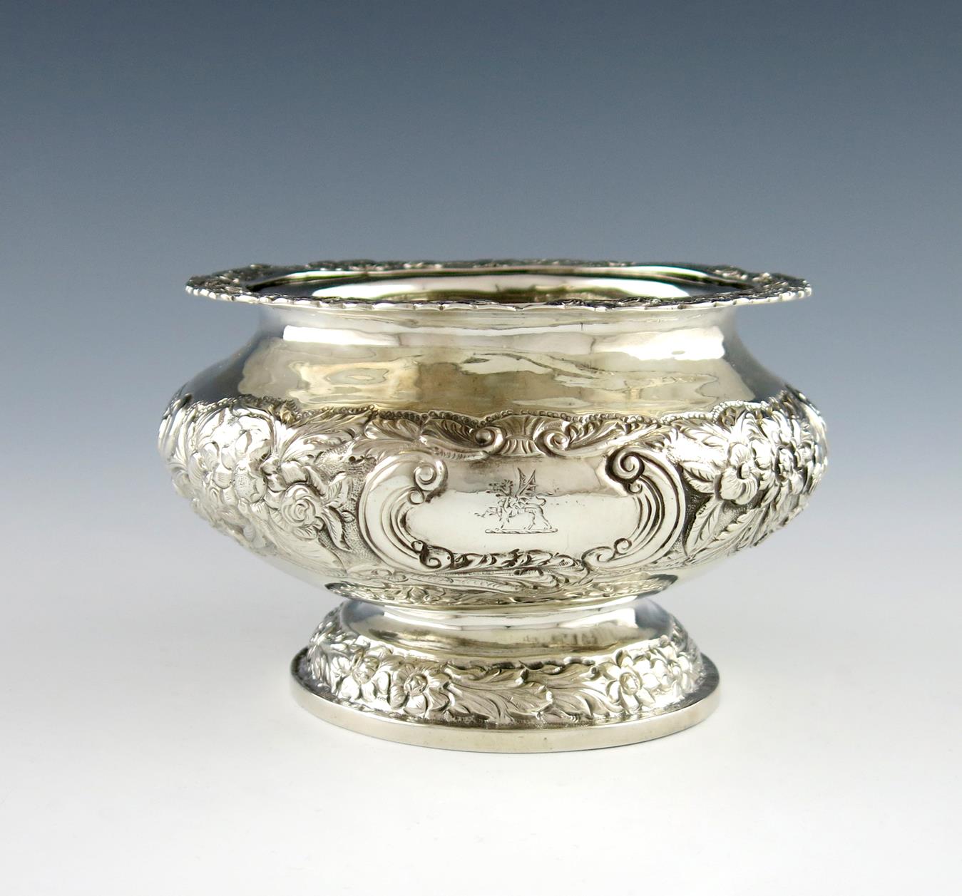 circular bellied form, embossed with foliate scroll decoration, foliate borders, with two cartouches with a crest and initials, on a raised circular foot, diameter 15cm, approx. weight 10.2oz.