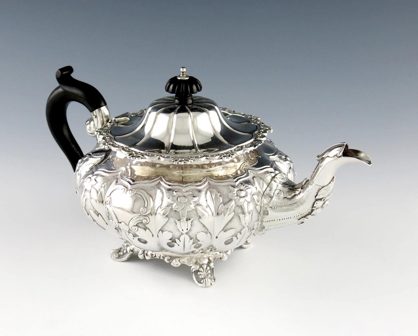 lobed circular form, embossed foliate decoration on a matted background, fluted hinged cover, scroll handle, on four foliate bracket feet, length handle to spout 27.5cm, approx. weight 19.4oz.